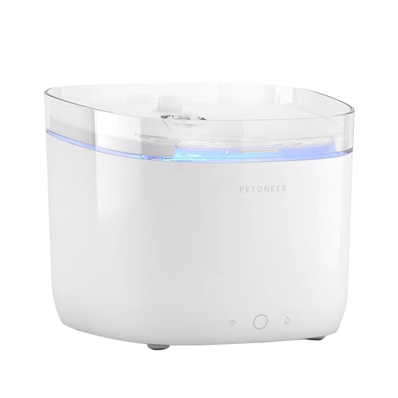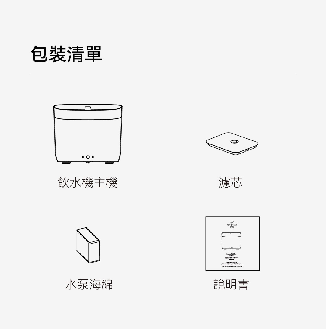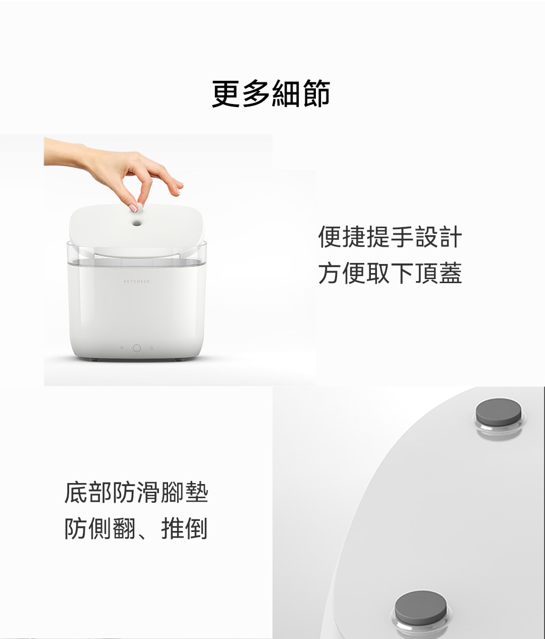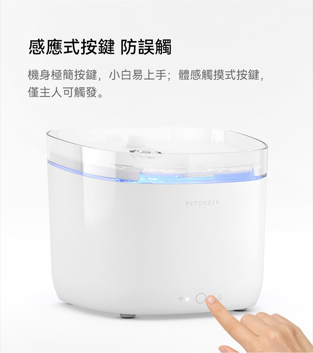 - 主機簡約按鍵,採用體感觸摸式按鍵,僅主人可觸發,底部設置了防滑腳墊,杜絕側翻及寵物推到,供水蓋 7 度傾斜工學設計,喝水不濕鬍鬚