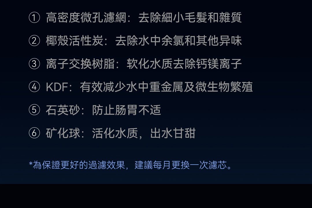 - 篩檢程式包含:高密度微孔濾網可去除細小毛髮雜質;椰殼活性炭可去除水中餘氯和其他異味;離子交換樹脂可軟化水質去除鈣鎂離子;KDF 可有效減少水中重金屬及微生物繁殖;石英砂可防止腸胃不適;礦化球可活化水質出水甘甜。過濾效果顯著提升,每一口都是鮮活水