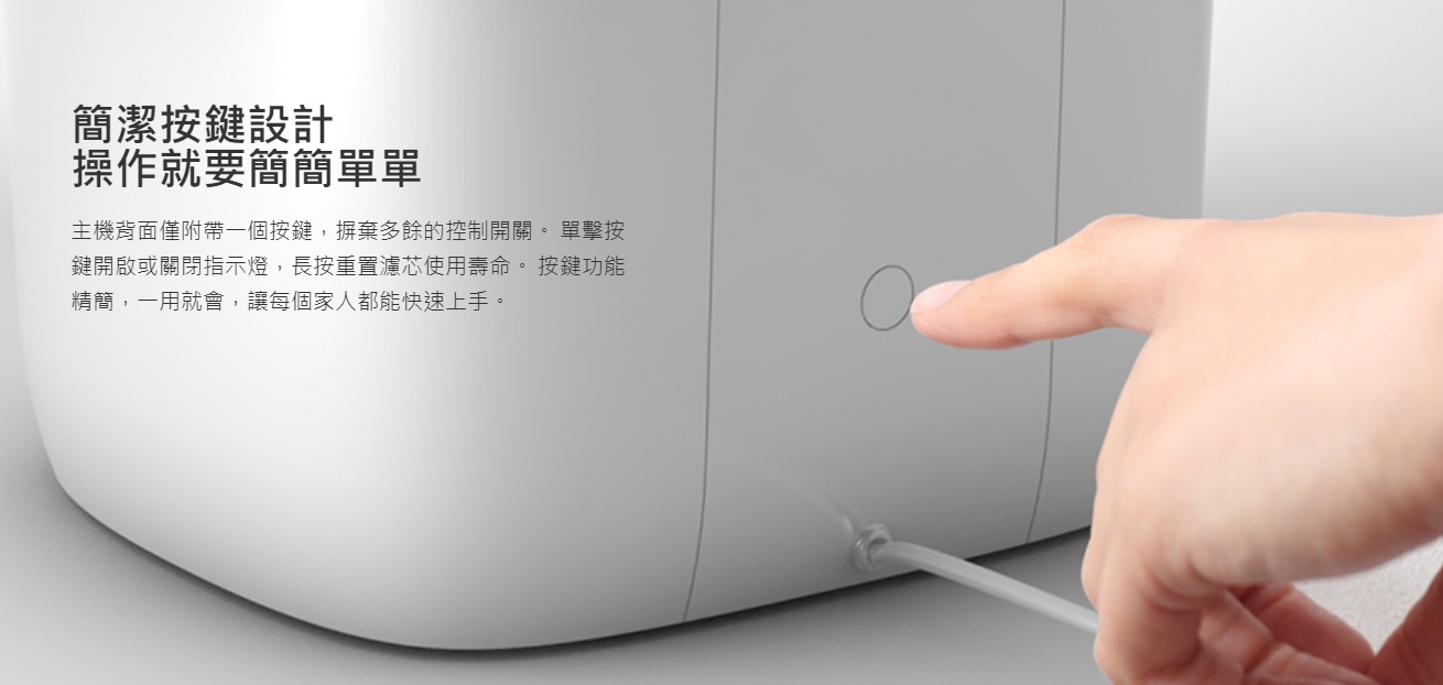 - 智能指示燈提醒,使用更省心。主機背面僅附帶一個按鍵,摒棄多餘的控制開關。 單擊按鍵開啟或關閉指示燈,長按重置濾芯使用壽命。 按鍵功能精簡,一用就會,讓每個家人都能快速上手