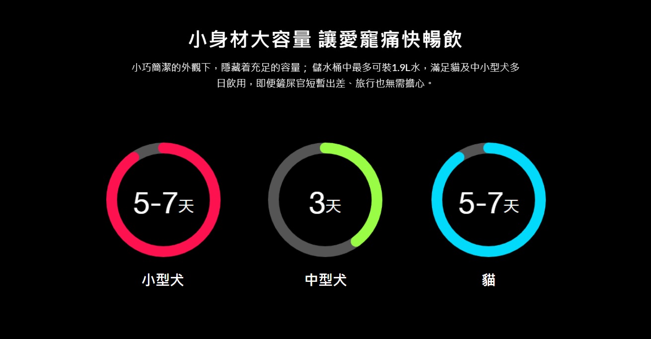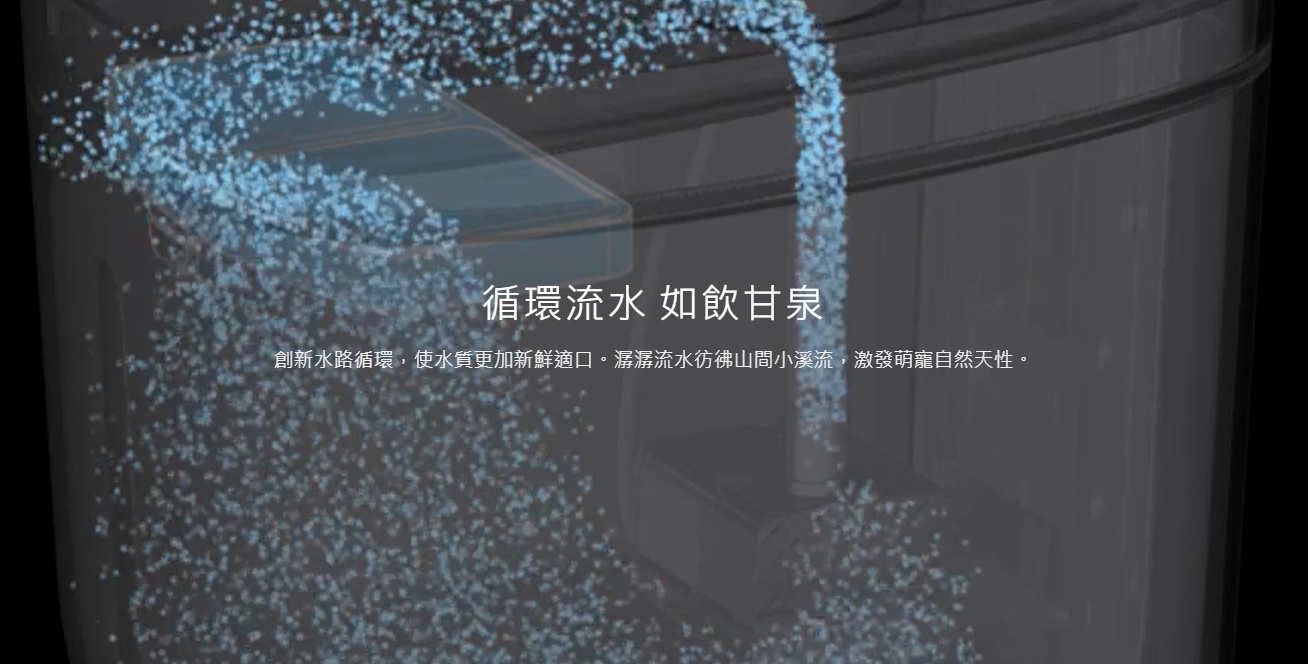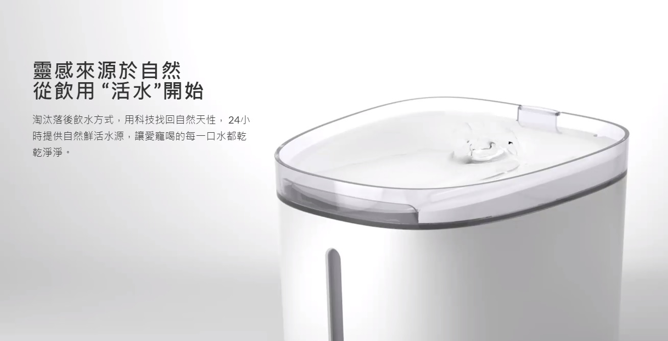 - 淘汰落後飲水方式,用科技找回自然天性, 24 小時提供自然鮮活水源,讓愛寵喝的每一口水都乾乾淨淨
