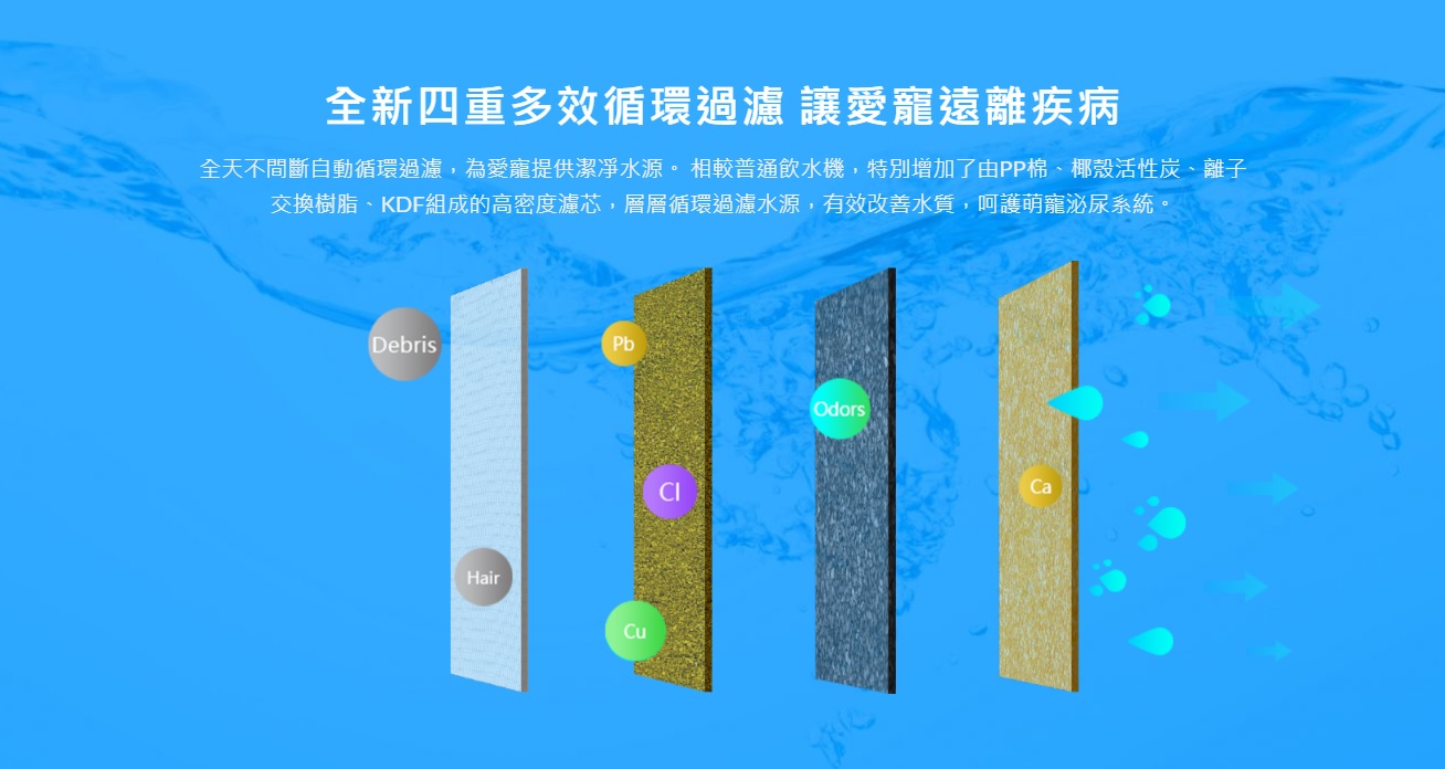 - 全天不間斷自動循環過濾,為愛寵提供潔凈水源。相較普通飲水機,特別增加了由 PP 棉、椰殼活性炭、離子交換樹脂、KDF 組成的高密度濾芯,層層循環過濾水源,有效改善水質,呵護萌寵泌尿系統