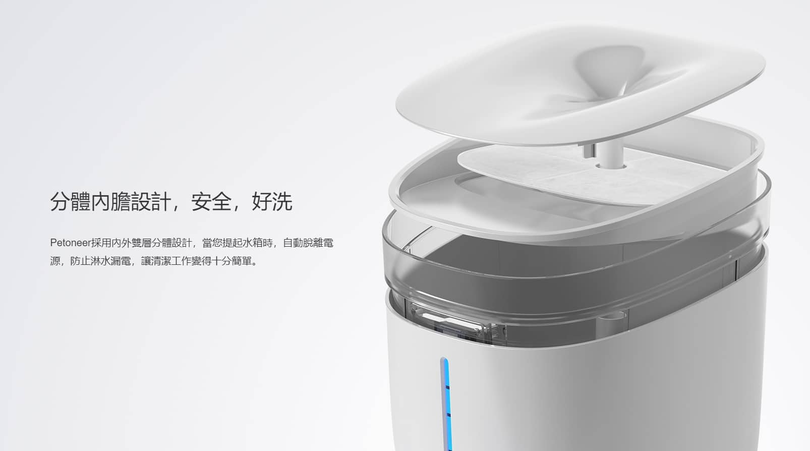 - PETONEER 採用內外雙層分體設計,當您提起水箱時,自動脫離電源,防止淋水漏電,讓清潔工作變得十分簡單