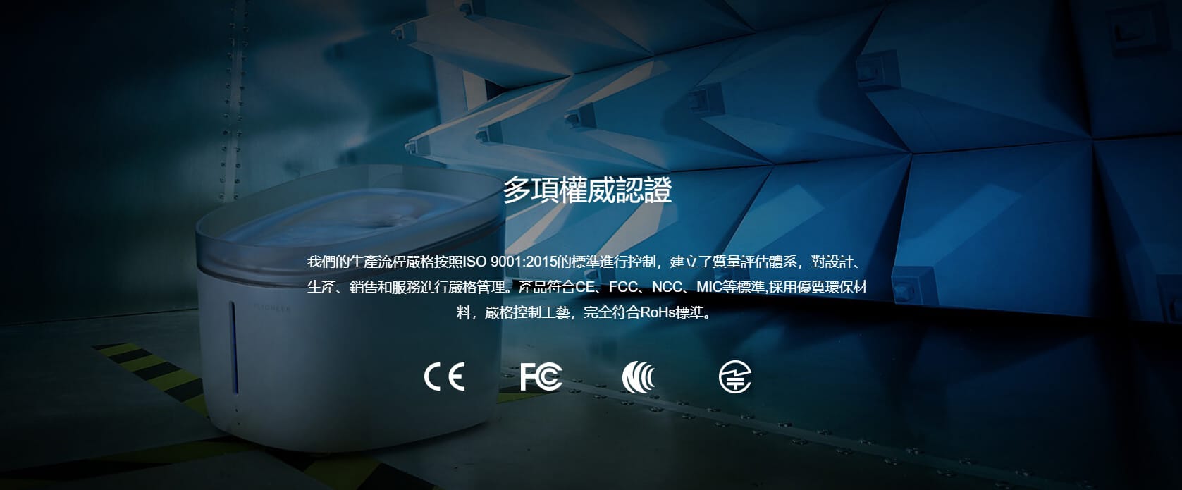 - 我們的生產流程嚴格按照 ISO 9001:2015 的標準進行控制,建立了質量評估體系,對設計、生產、銷售和服務進行嚴格管理。產品符合 CE、FCC、NCC、MIC 等標準,採用優質環保材料,嚴格控制工藝,完全符合 RoHs 標準