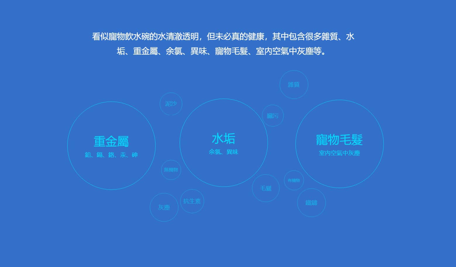 - 看似寵物飲水碗的水清澈透明,但未必真的健康,其中包含很多雜質、水垢、重金屬、余氯、異味、寵物毛髮、室內空氣中灰塵等