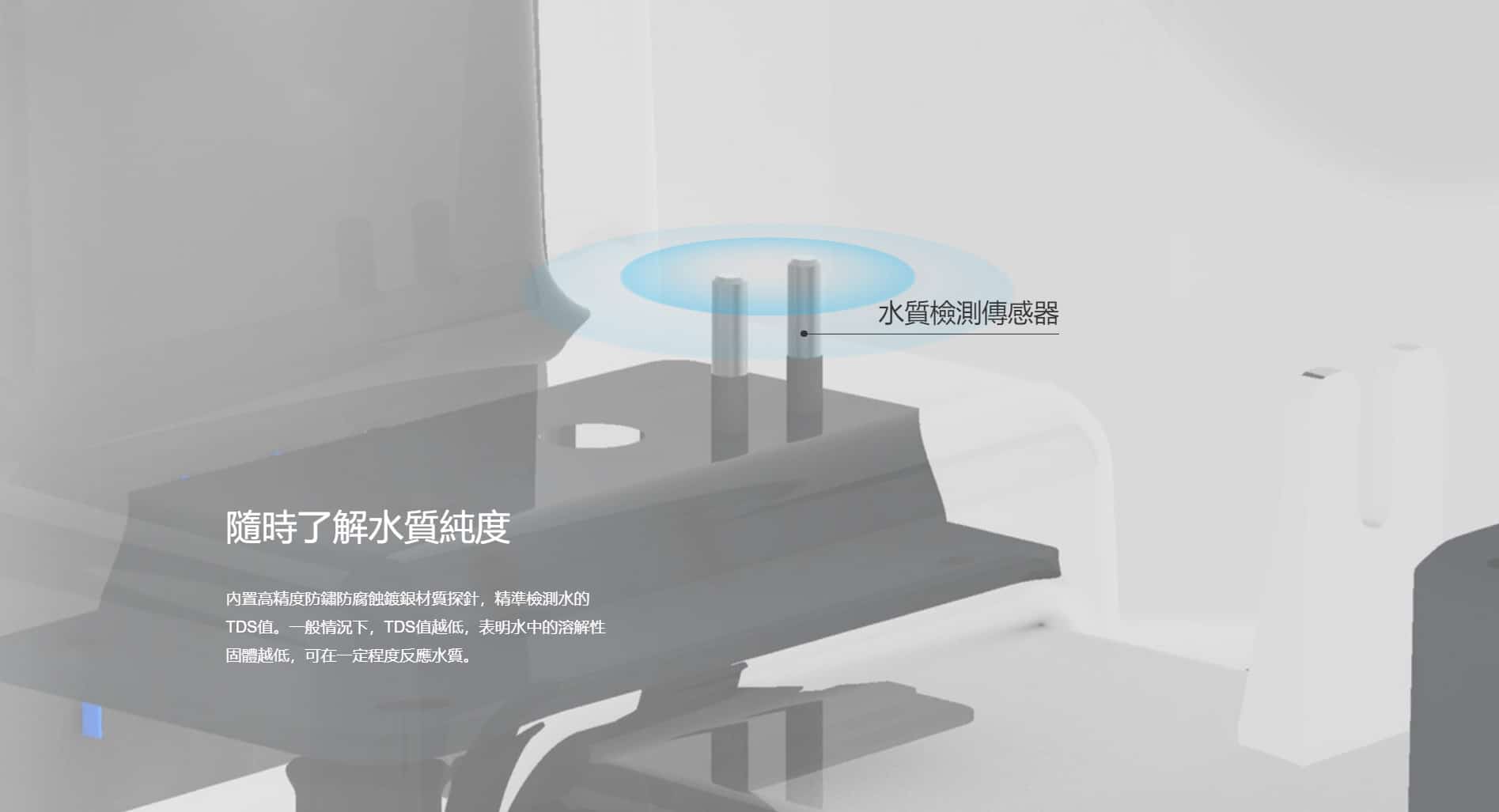 - 創新地加入了多色可視燈設計,把水量、水質和濾芯狀態功能集於一體顯示,自動變化顏色,讓你可以直觀感知水量,水質變化
