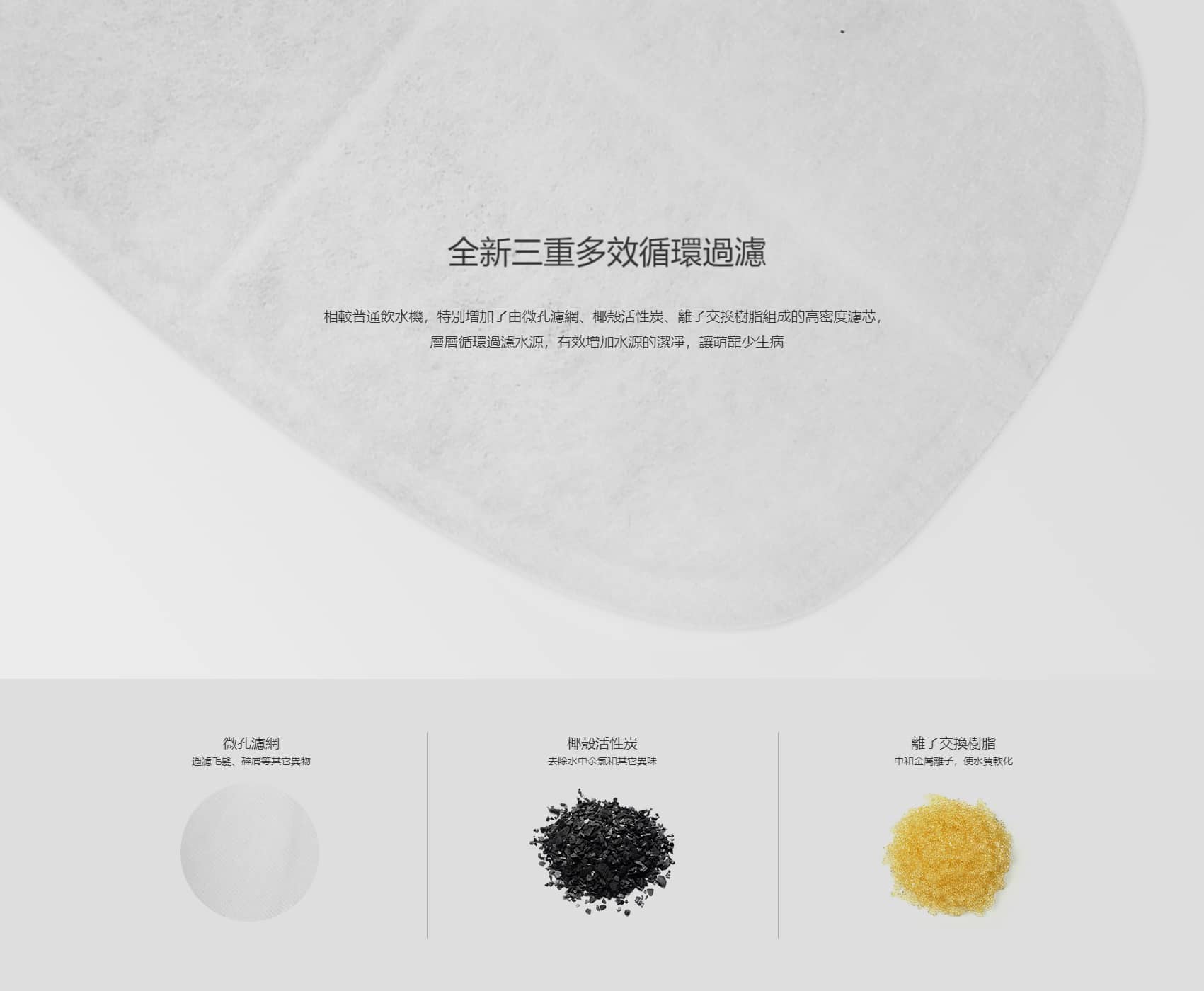 - 相較普通飲水機,特別增加了由微孔濾網、椰殼活性炭、離子交換樹脂組成的高密度濾芯,層層循環過濾水源,有效增加水源的潔凈,讓萌寵少生病