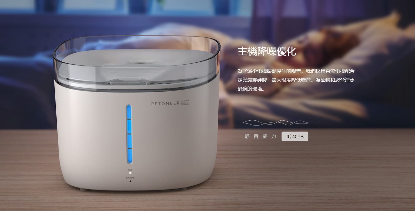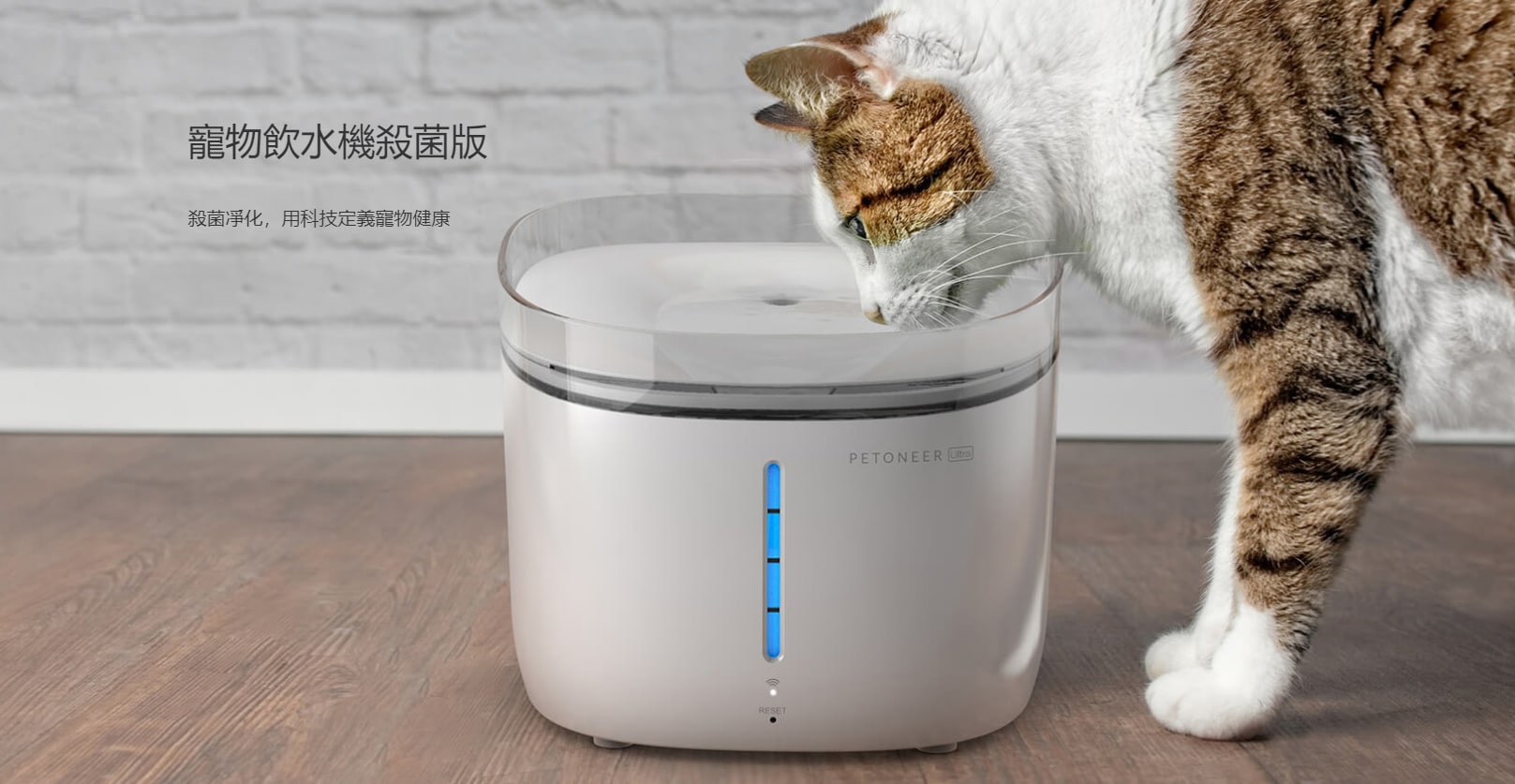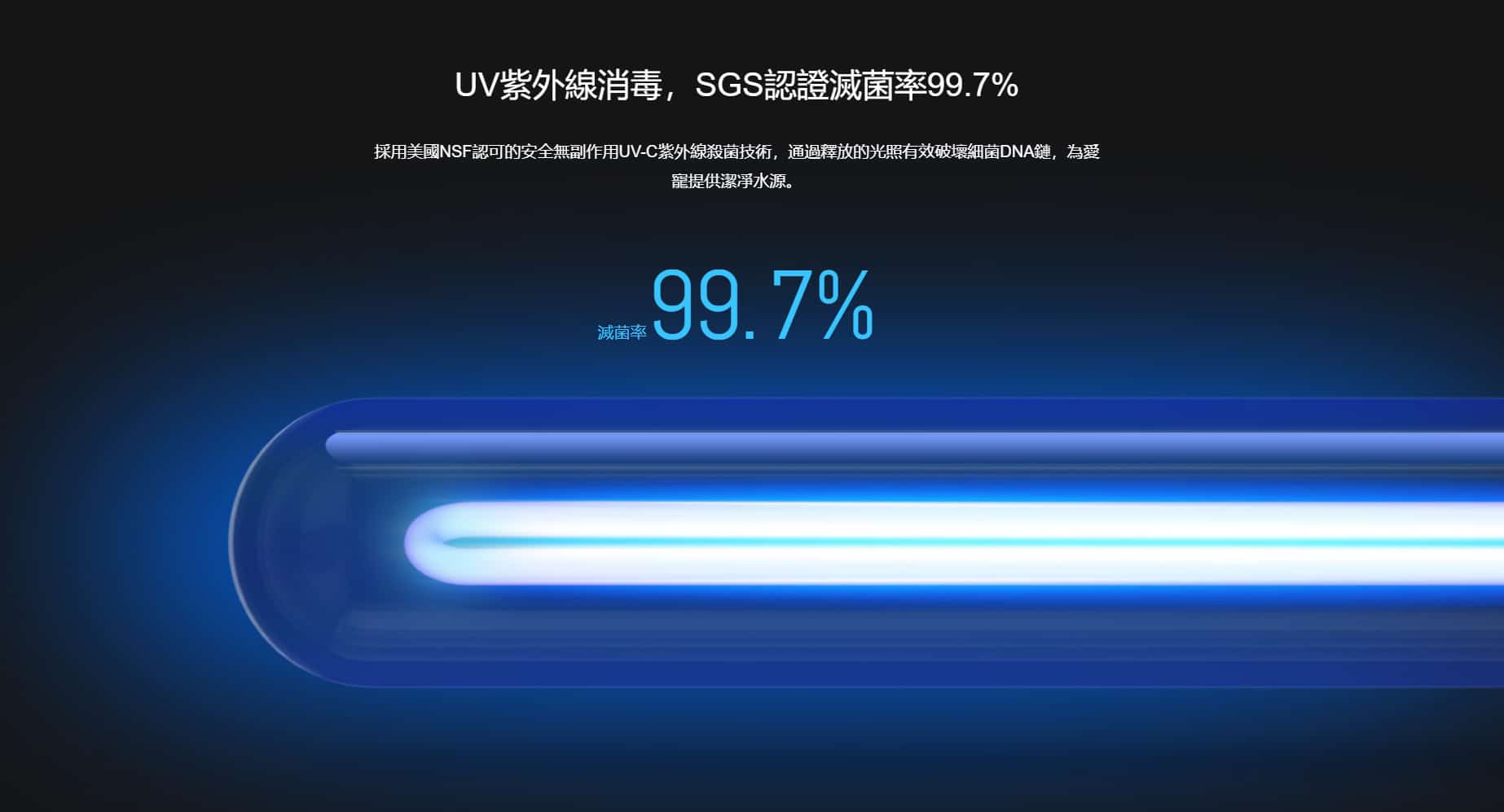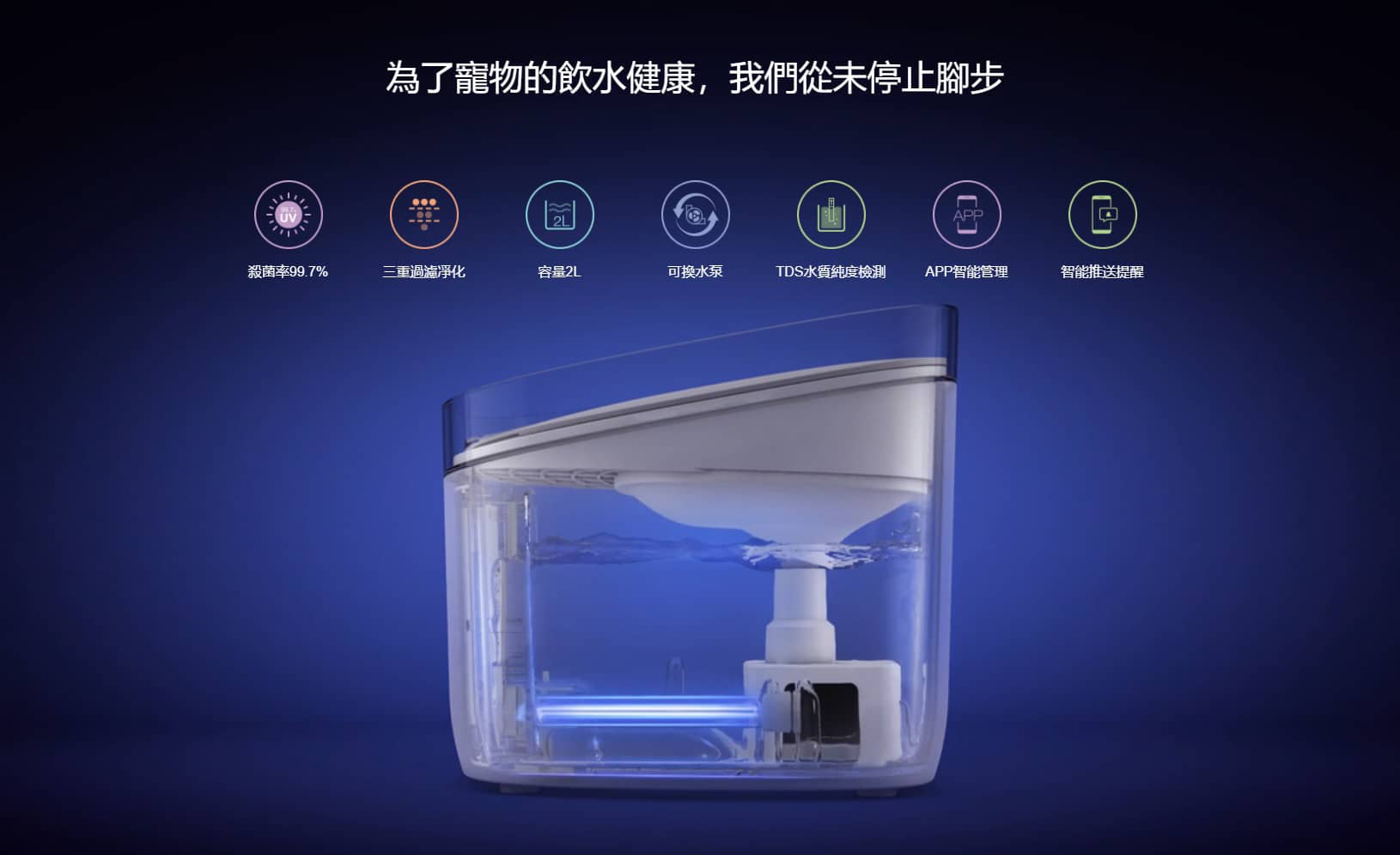 - UV 紫外線消毒,SGS 認證滅菌率 99.7%,採用美國 NSF 認可的安全無副作用 UV-C 紫外線殺菌技術,通過釋放的光照有效破壞細菌 DNA 鏈,為愛寵提供潔凈水源