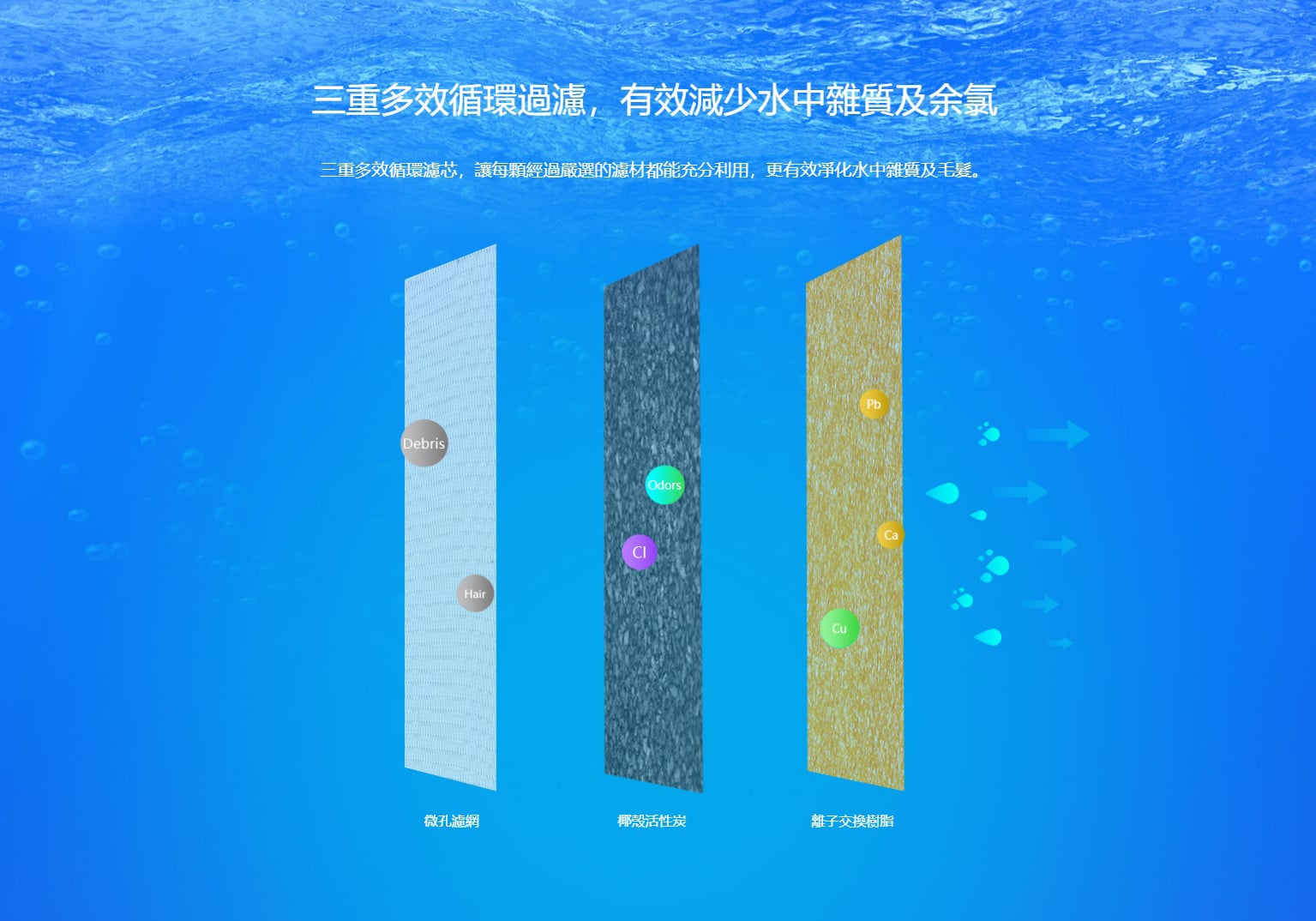 - 三重多效循環濾芯,讓每顆經過嚴選的濾材都能充分利用,更有效凈化水中雜質及毛髮