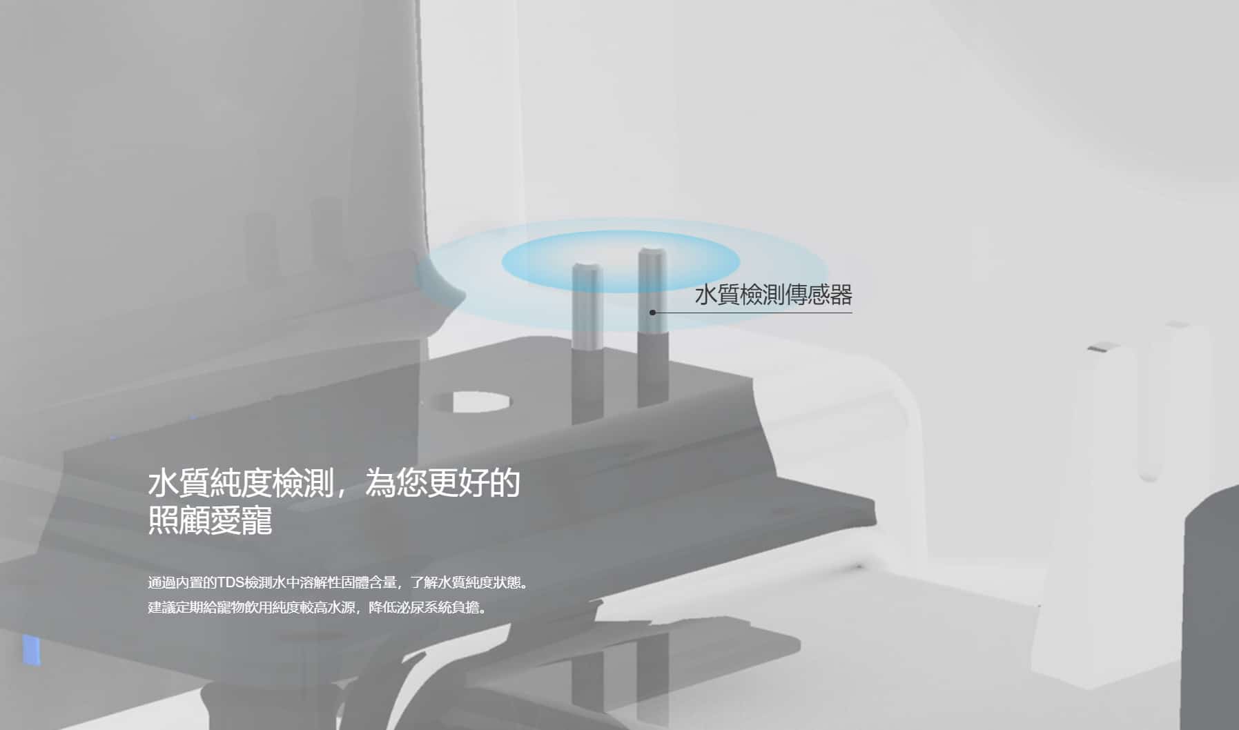 - 通過內置的 TDS 檢測水中溶解性固體含量,了解水質純度狀態。建議定期給寵物飲用純度較高水源,降低泌尿系統負擔