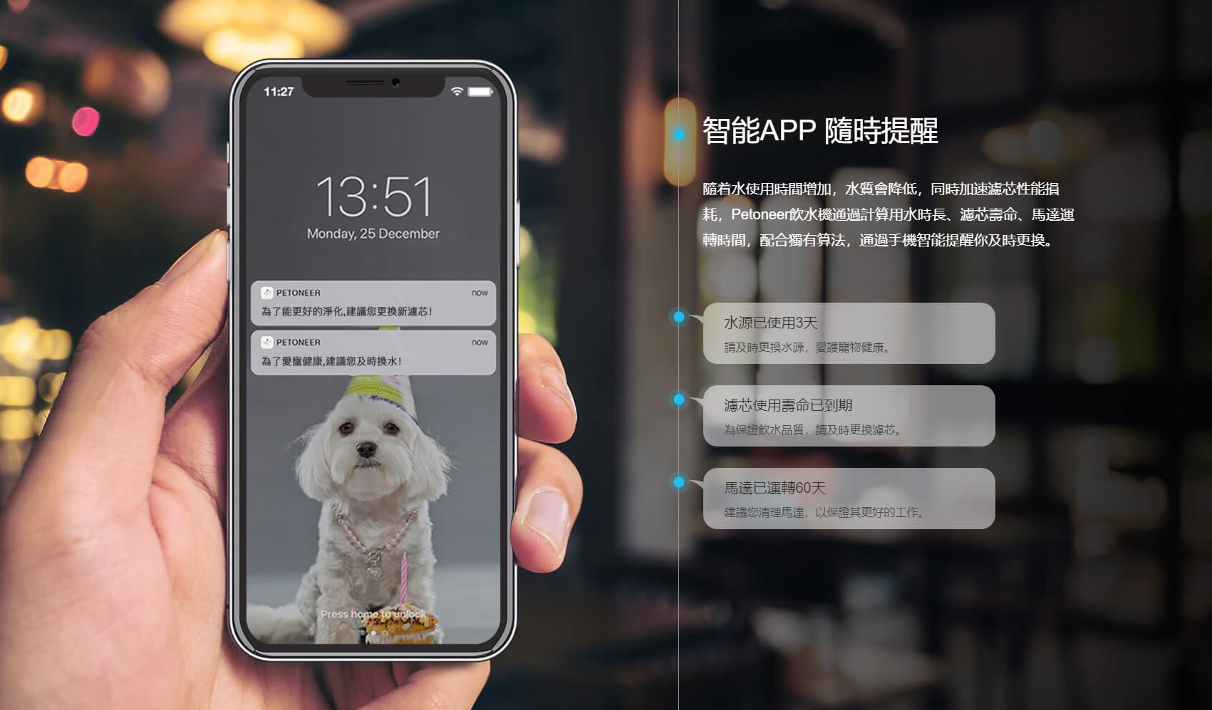 - 隨著水使用時間增加,水質會降低,同時加速濾芯性能損耗,PETONEER 飲水機通過計算用水時長、濾芯壽命、馬達運轉時間,配合獨有算法,通過手機智能提醒你及時更換
