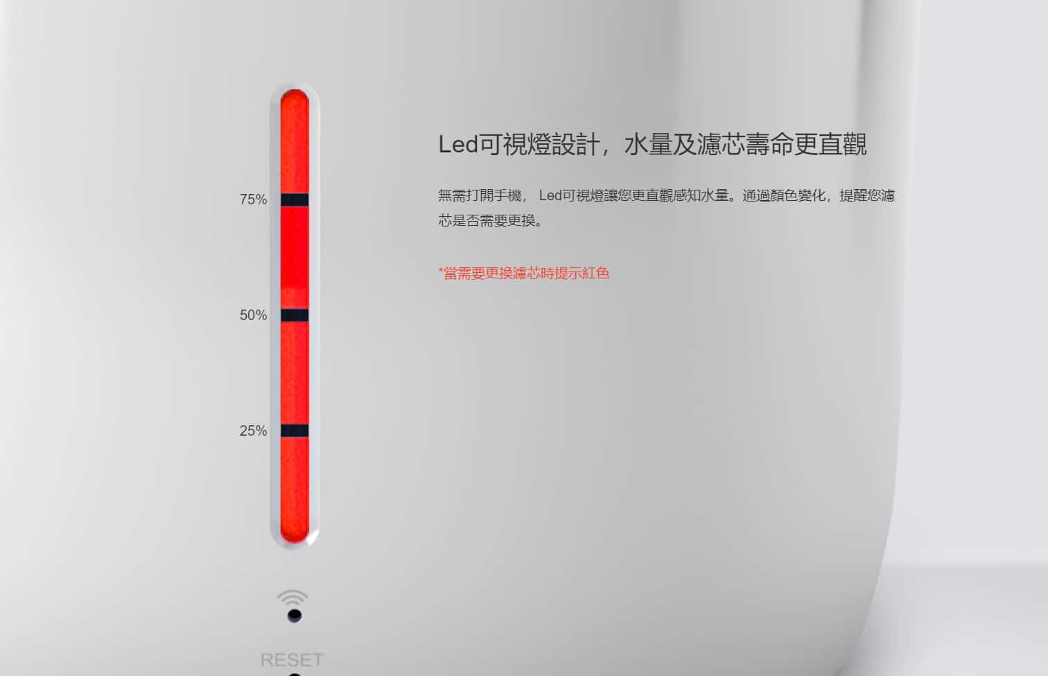 - 無需打開手機,LED 可視燈讓您更直觀感知水量。通過顏色變化,提醒您濾芯是否需要更換。當需要更換濾芯時提示紅色