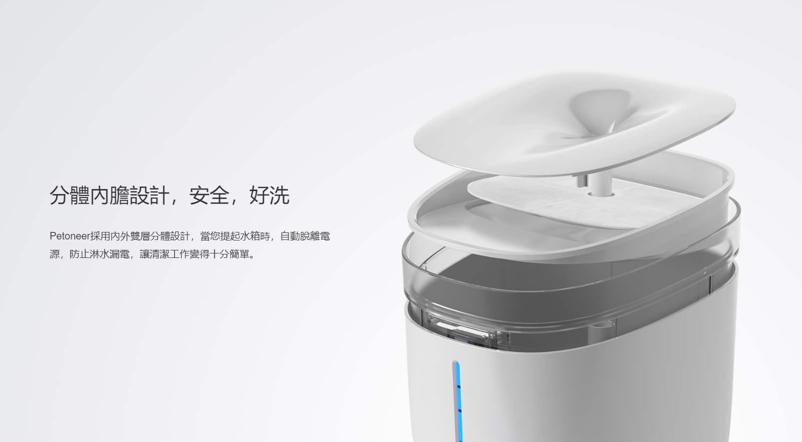 - PETONEER 採用內外雙層分體設計,當您提起水箱時,自動脫離電源,防止淋水漏電,讓清潔工作變得十分簡單
