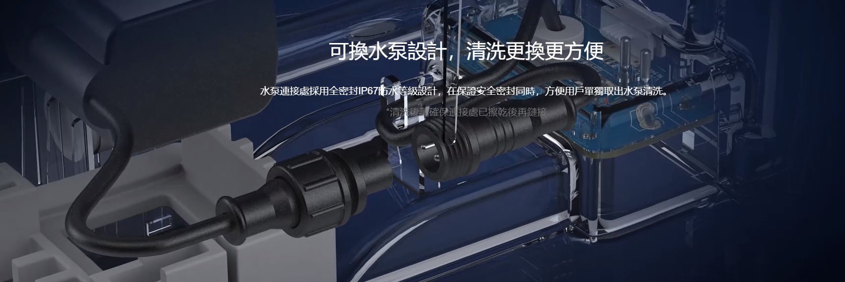 - 水泵連接處採用全密封 IP67 防水等級設計,在保證安全密封同時,方便用戶單獨取出水泵清洗。清洗後請確保連接處已擦乾後再鏈接