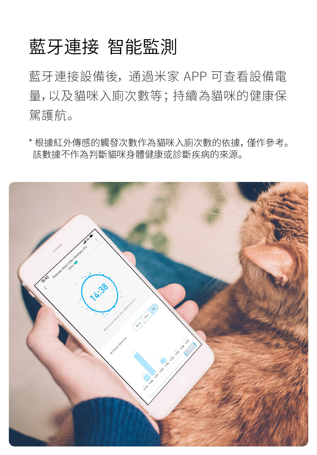 - 藍牙連接設備後,通過 PETONEER APP 可查看設備電量,以及貓咪入廁次數等;持續為貓咪的健康保駕護航