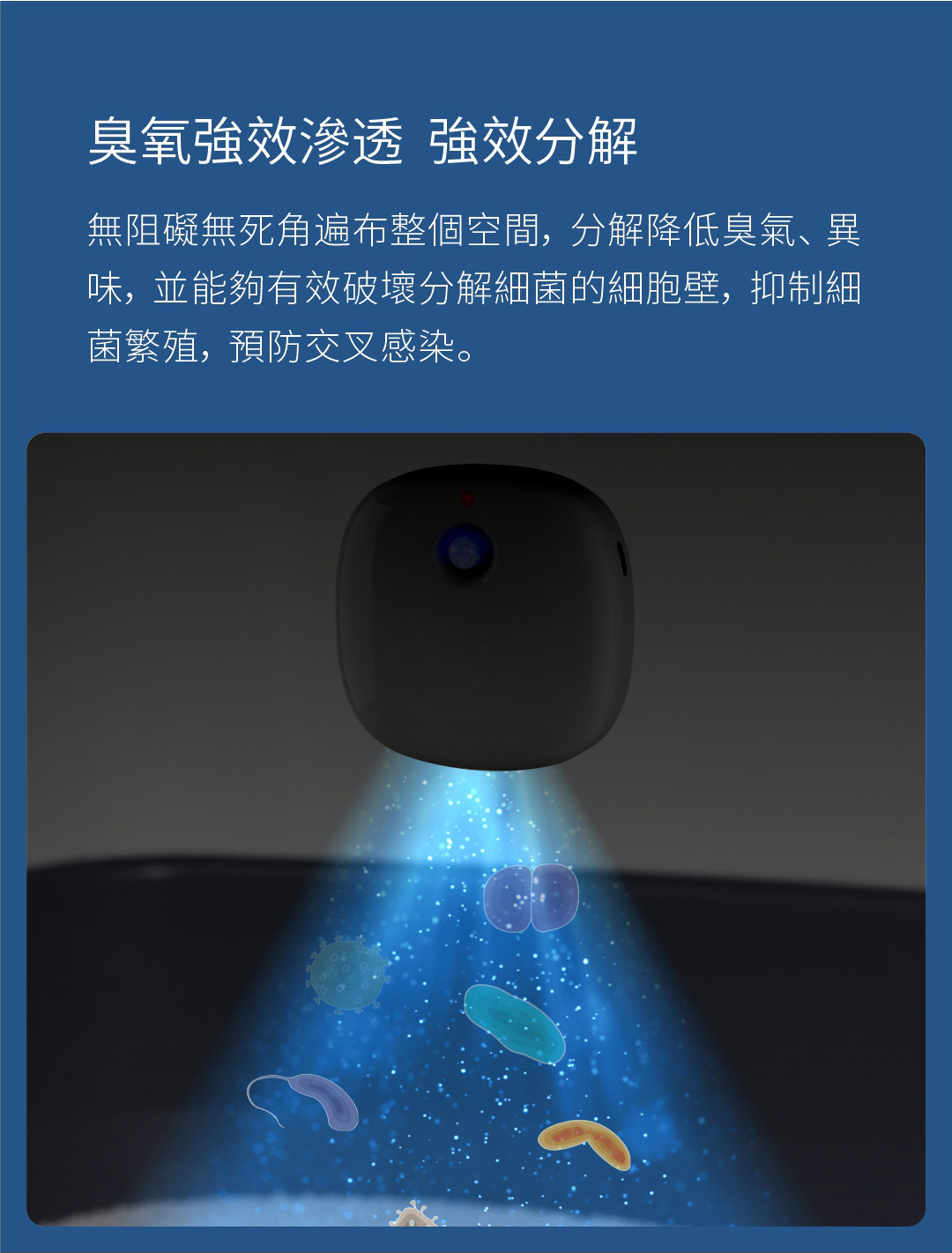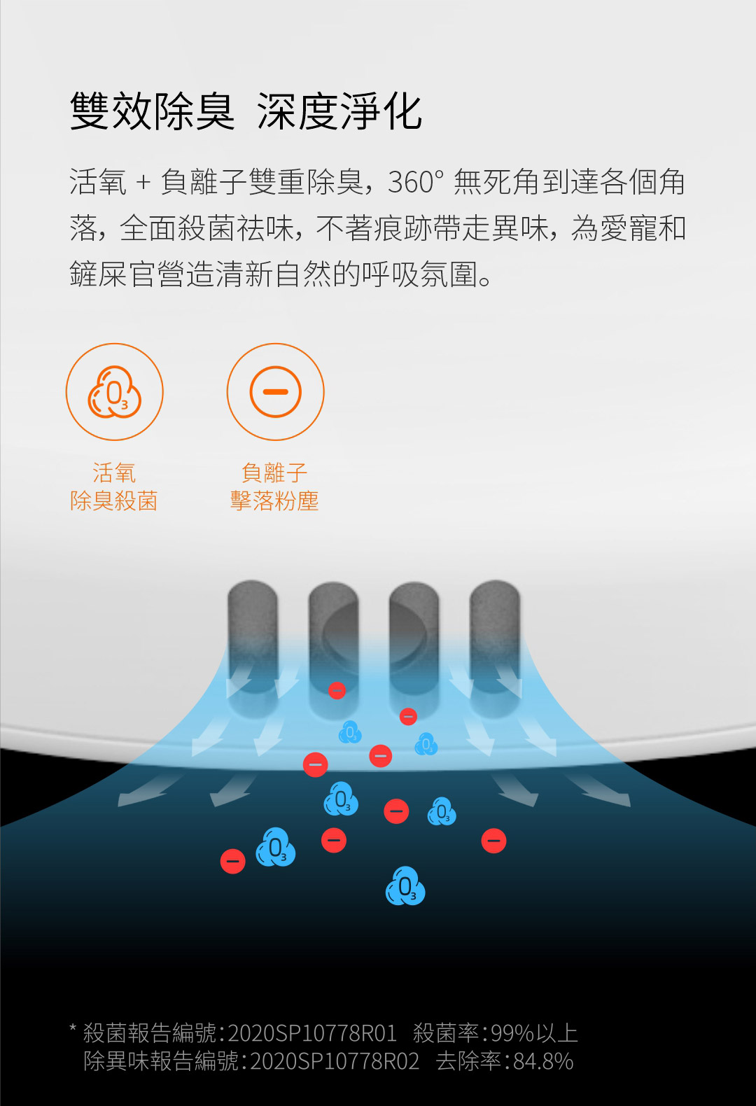 - 實現了活氧 + 負離子雙重除臭,360 度無死角到達各個角落,除菌更全面,為愛寵和鏟屎官營造清新自然的呼吸氛圍