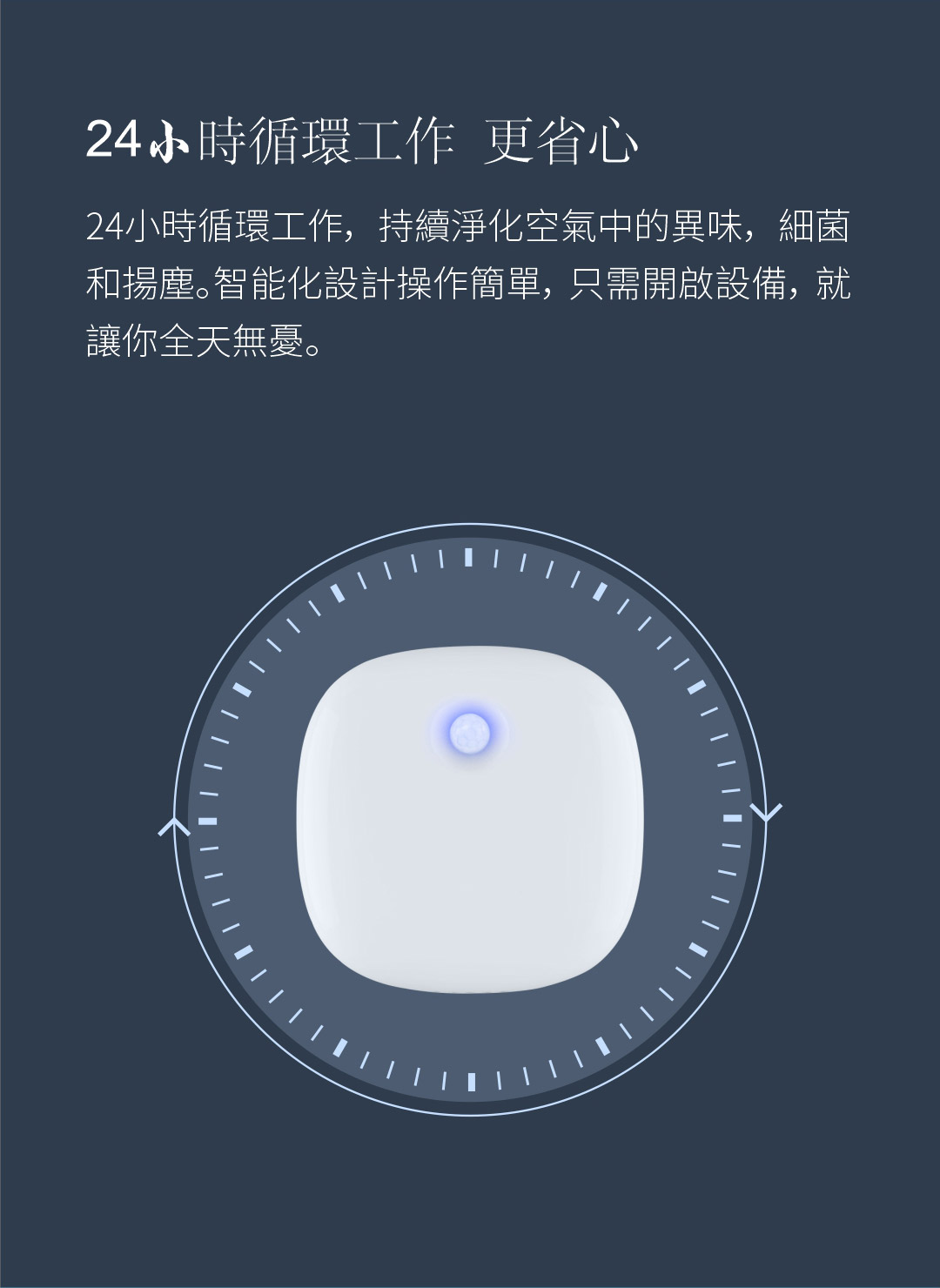 - 24 小時循環工作,每 15s 工作 15s,持續淨化空氣中的異味、細菌和揚塵,智能化設計操作簡單,只需開啟設備,就能讓您全天無憂