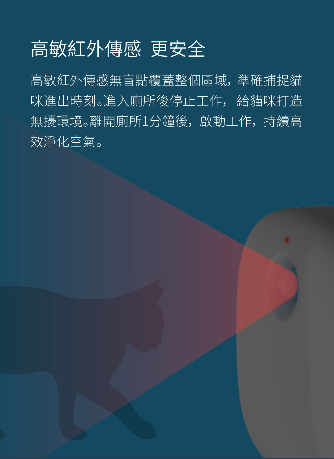 - 機器內置高敏紅外感應器,無盲點覆蓋機器周邊區域,準確捕捉貓咪進出,寵物進去廁所後停止工作,給寵物打造無憂環境,離開廁所一分鐘後,再啟動工作