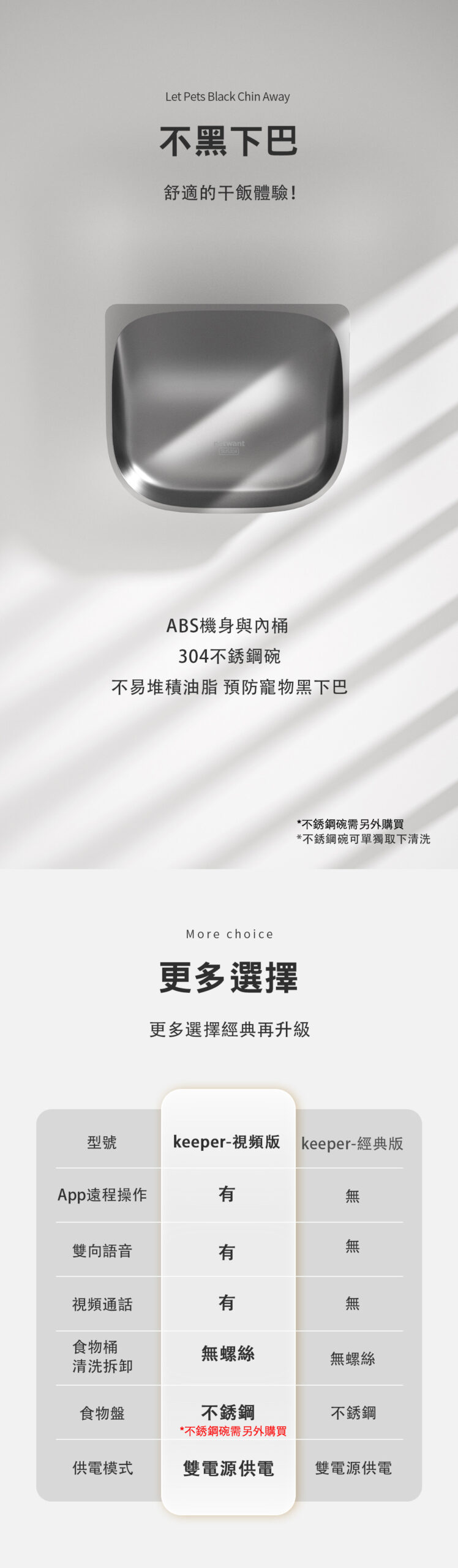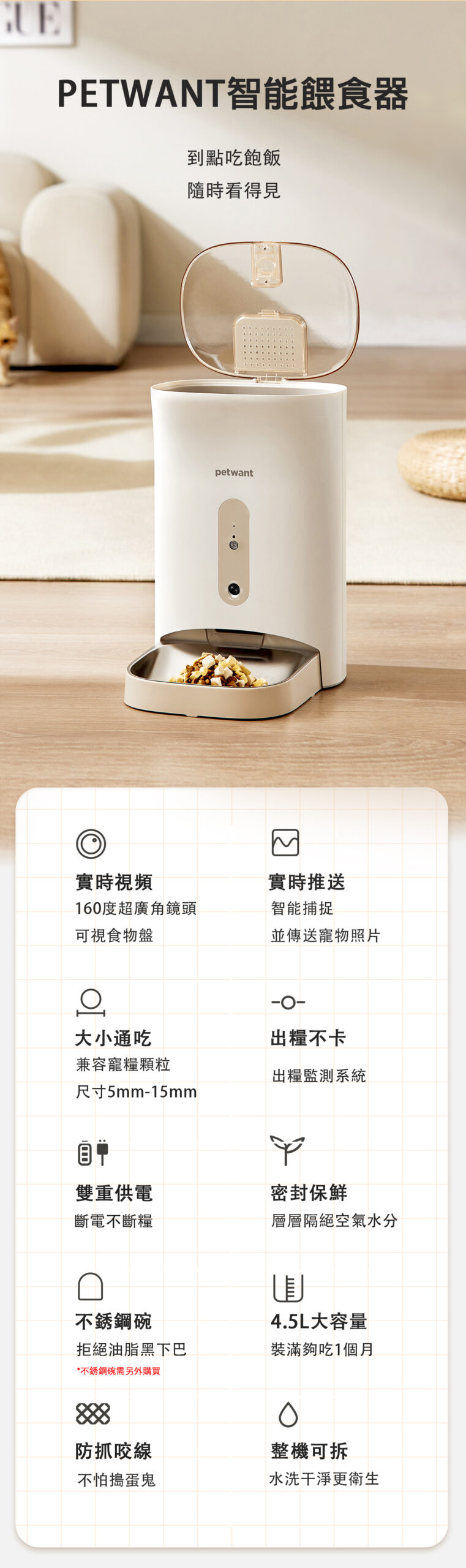 - 配有不鏽鋼糧碗,更易清潔