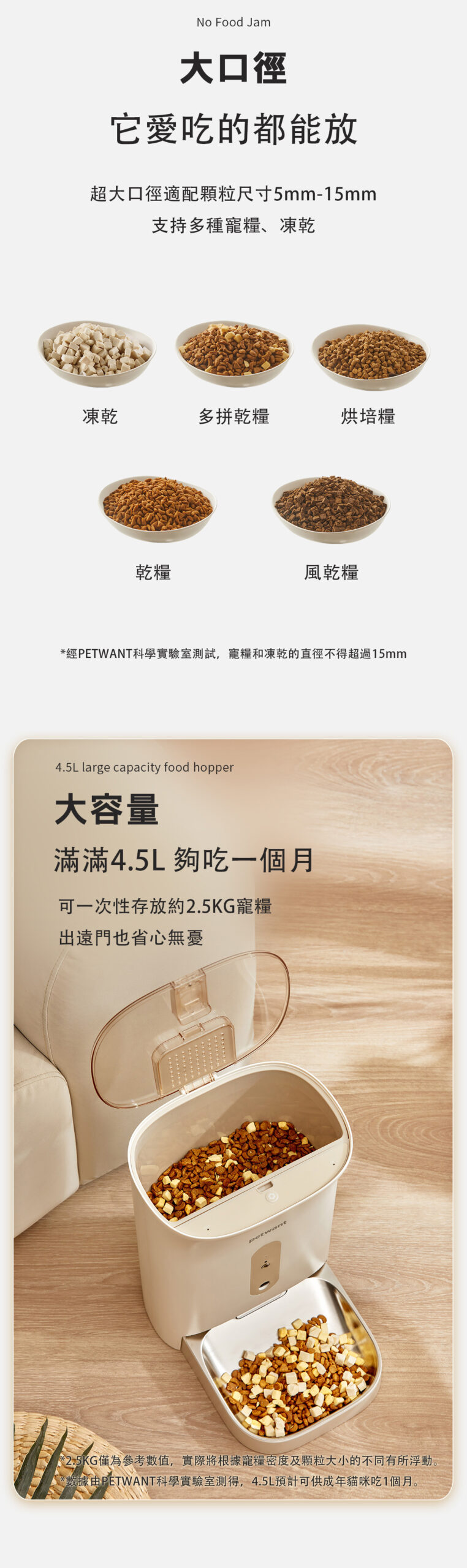 - 4.5L 容量食物桶,可放直徑為 5 – 15mm 的乾糧 / 風乾糧 / 凍乾糧