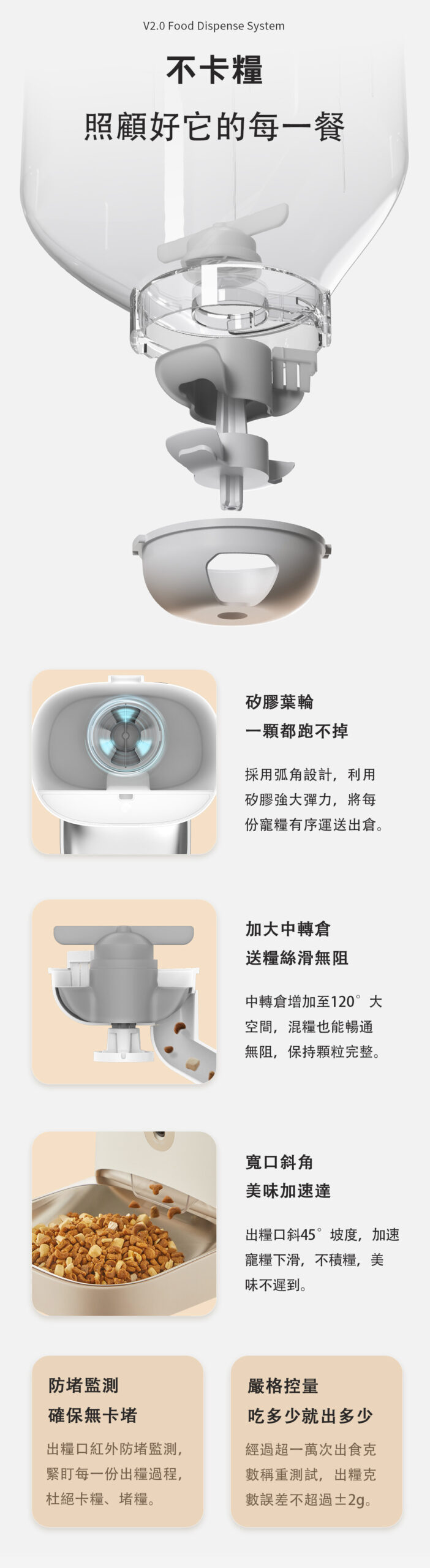 - 亦可設定每日餵食時間及份量:每日 1 – 4 餐,每餐 1 – 10 份,每份 8 – 10g