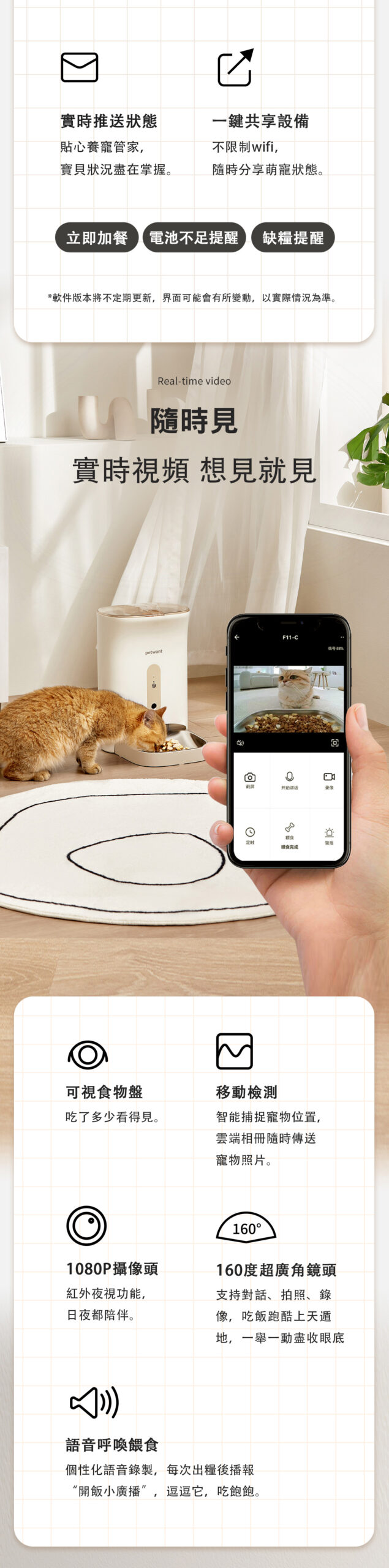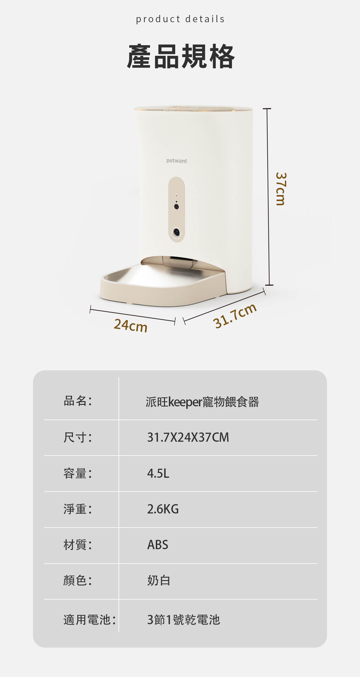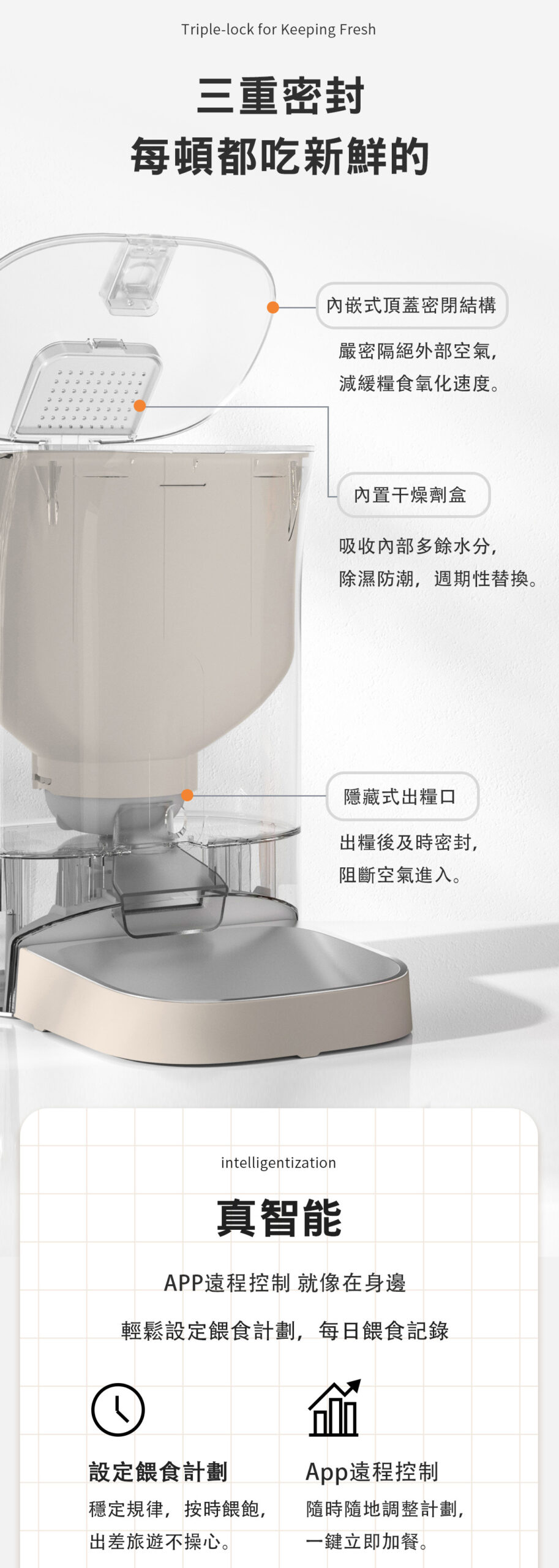- 支援 2.4Ghz WIFI 連接,可用 APP 搖控餵食