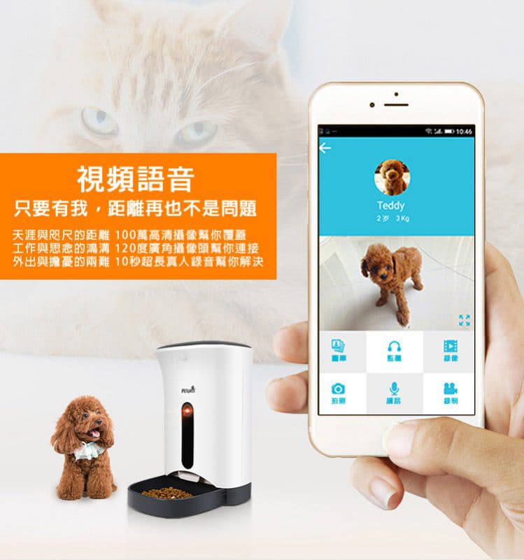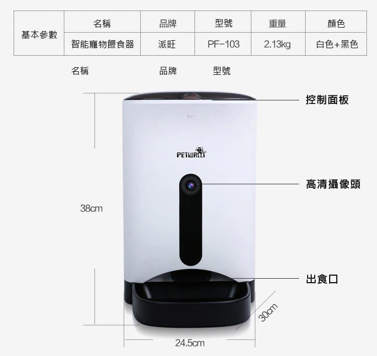 - PF-103 是 PETWANT 最新研發用智能手機應用程序控制的智能寵物餵食器,適用於所有貓咪和中小型狗狗。能夠預定時間或透過 APP 遠程餵食,更可以視頻監控或與愛寵實時對話