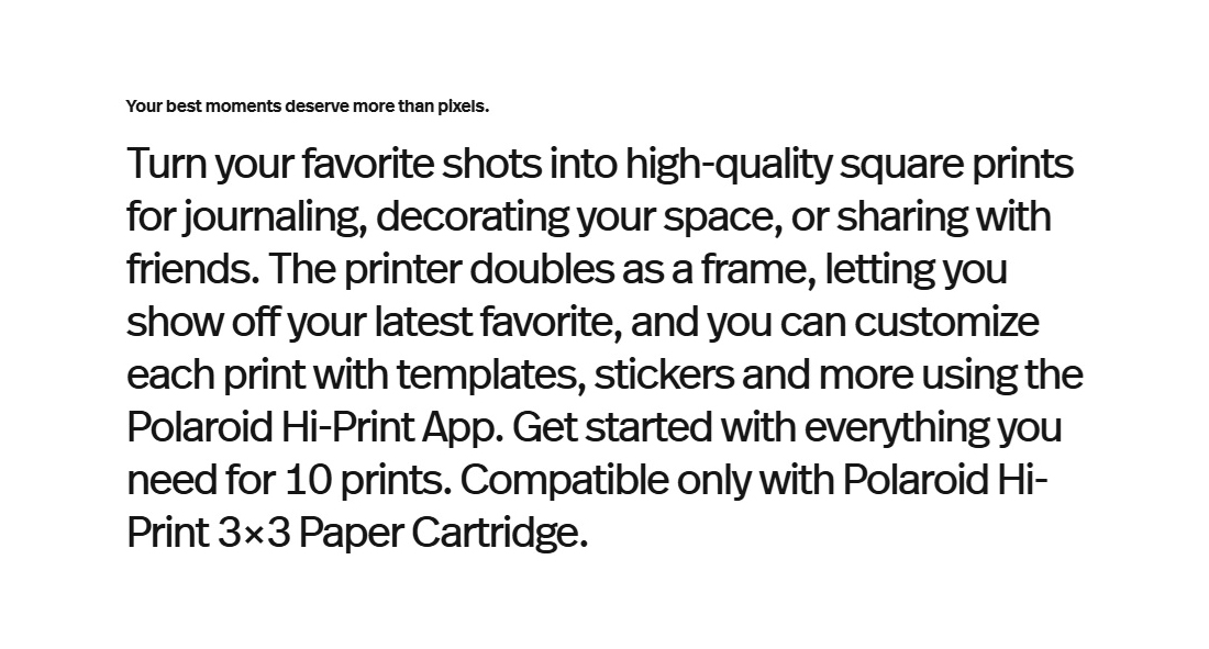 - Works with Polaroid Hi·Print 3×3 Paper Cartridge