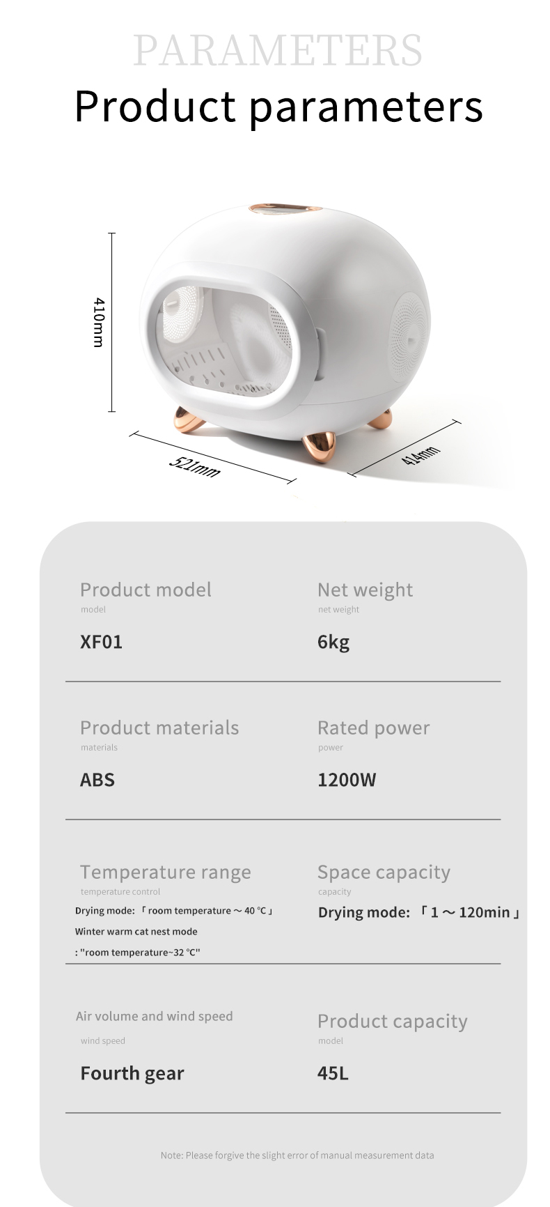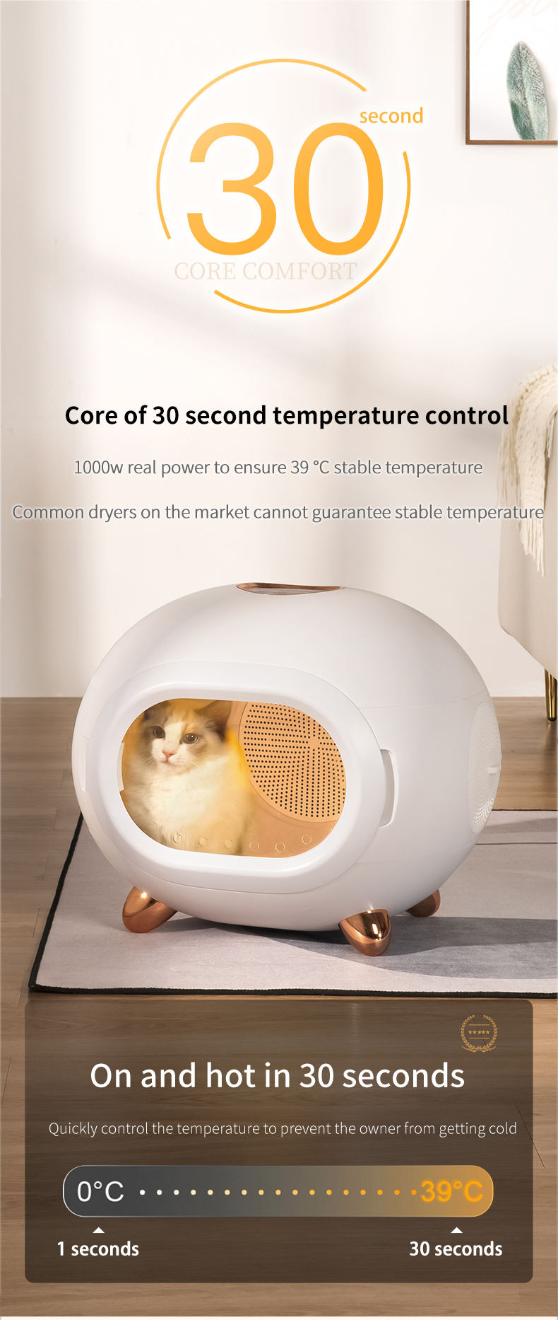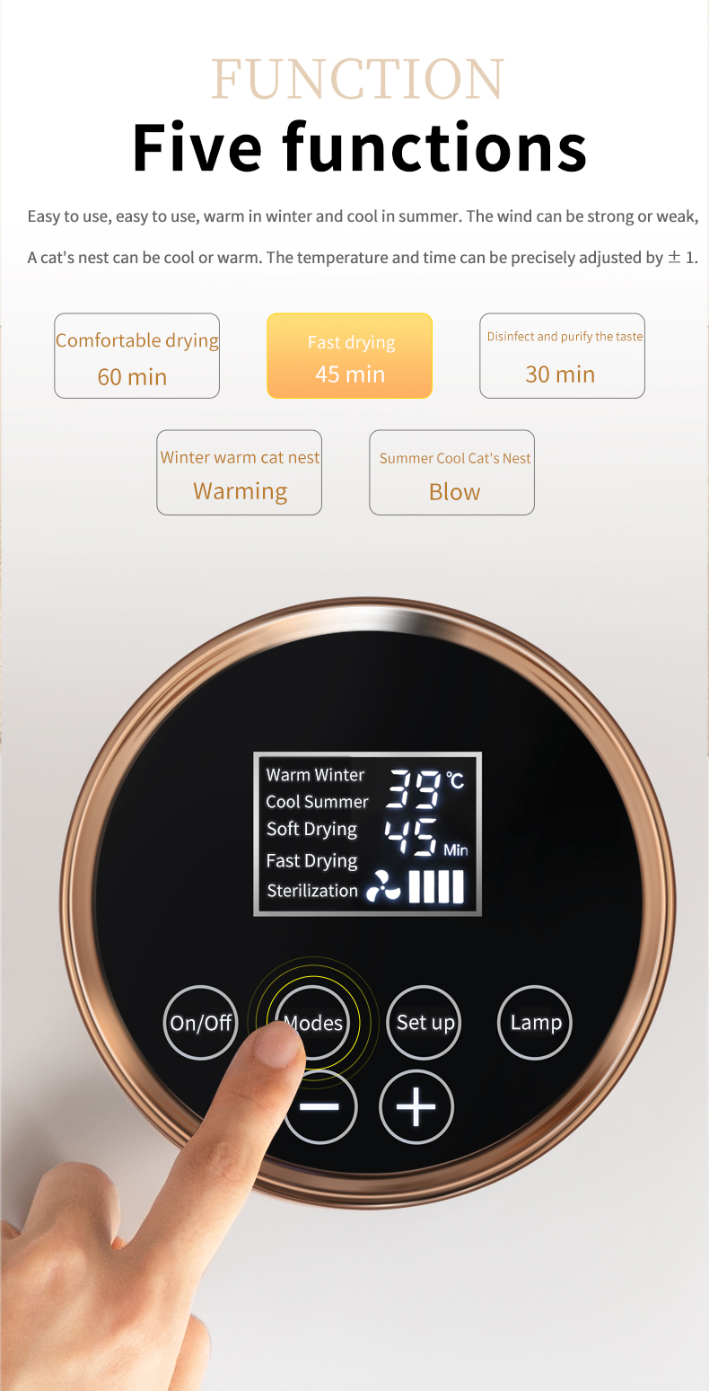 - 溫控範圍:烘乾模式 (室溫 – 40 度) / 冬暖貓窩模式 (室溫 – 32 度)