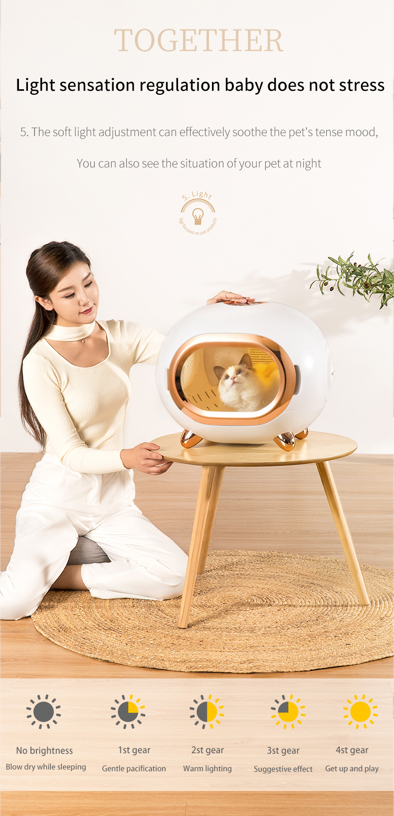 - 光感調節,5 重柔光燈調節,有效安撫寵物緊繃的情緒,晚上也可以看到愛寵的狀況