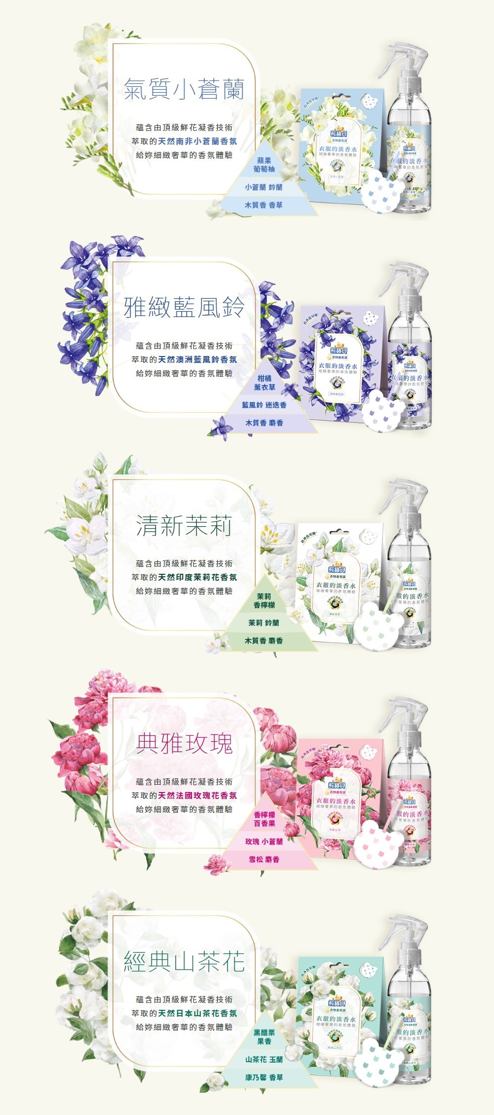 - 靈感來自高級訂製香水,由國際香氛專家精心調製,蘊含天然香氛精油,呈現如香水般具豐富層次感的奢華香調,仿若在衣物上噴了淡香水;特含「頂級鮮花凝香技術」,在鮮花綻放的瞬間凝粹馥郁芬芳,杜絕異味並讓衣服持久散發迷人淡香,更添個人自信與魅力風采