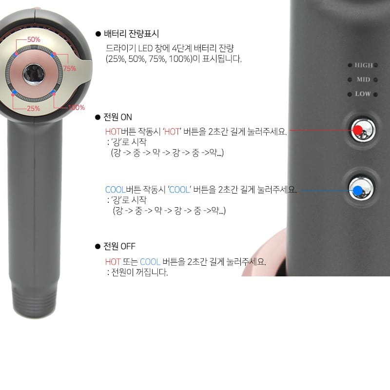 - 風筒完成整個充電,需時 2.5 小時,應避免過長的充電時間,過長的充電時間會令電池較易損壞及發熱