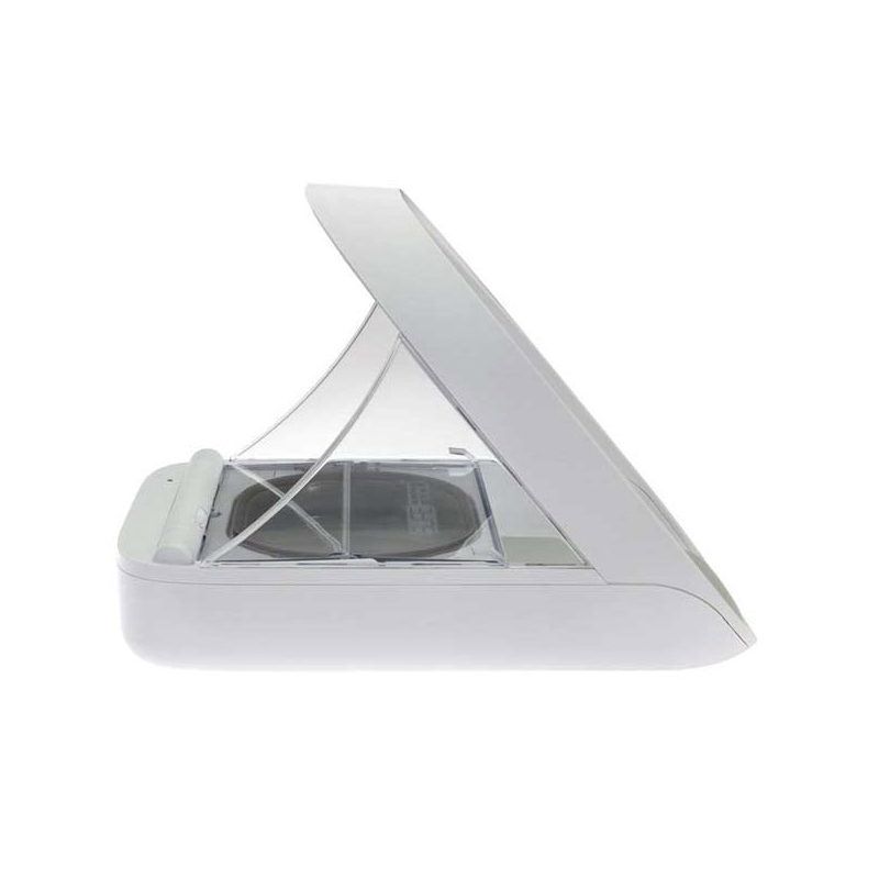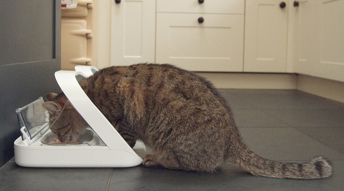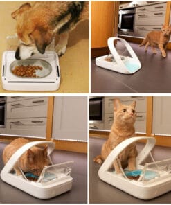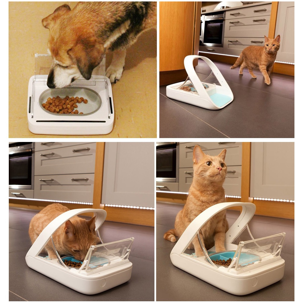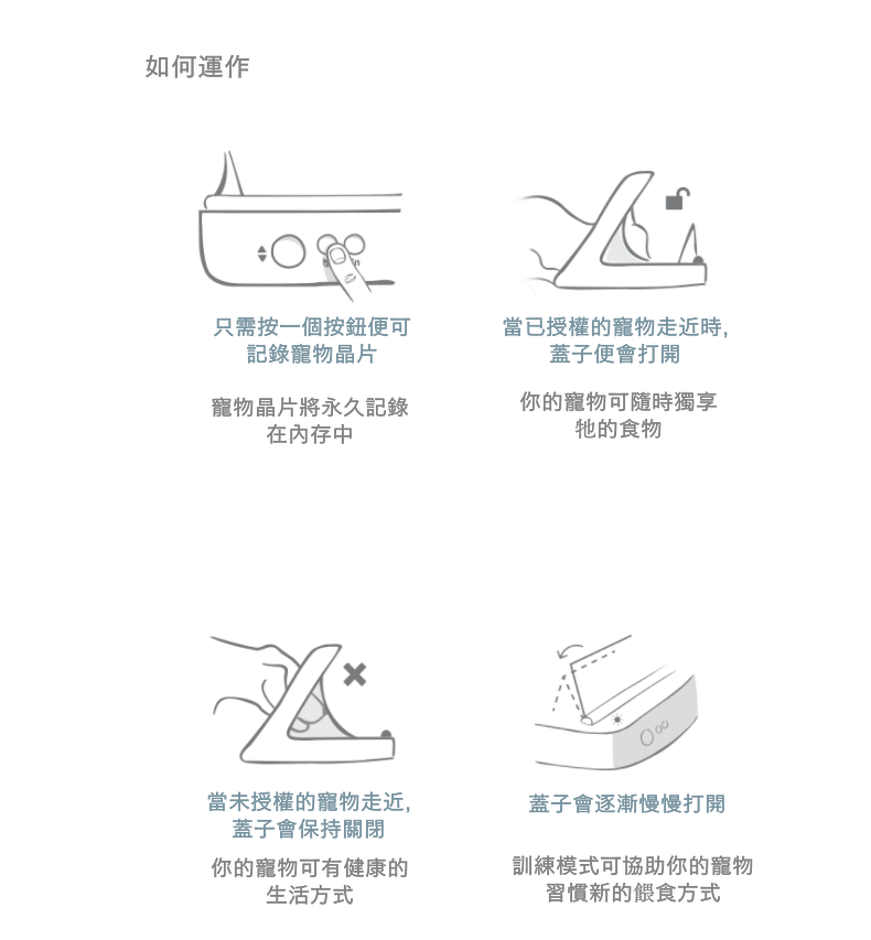 - 當特定的主子接近餵食器,蓋將會自動滑開,為主子提供食物,當主子吃完了,蓋便會收起來,防止其他主子吃到餵食器裡的食物