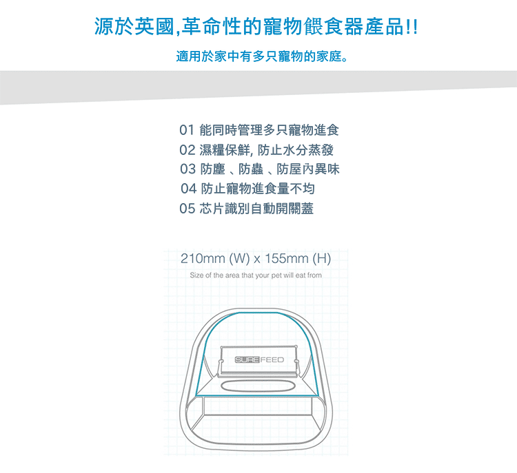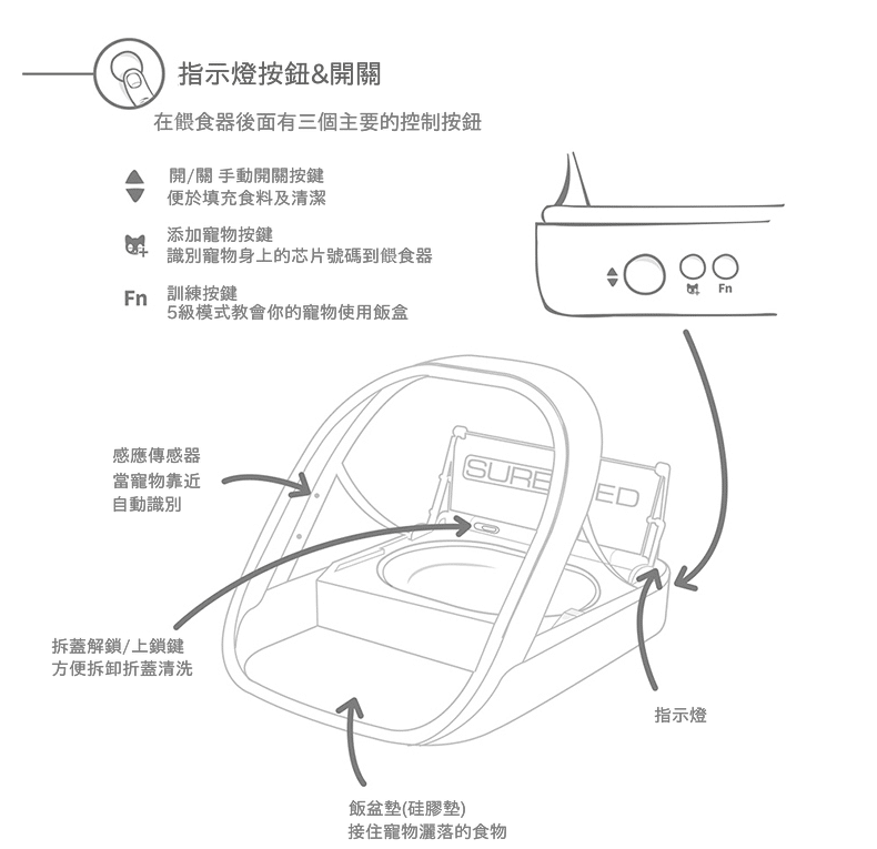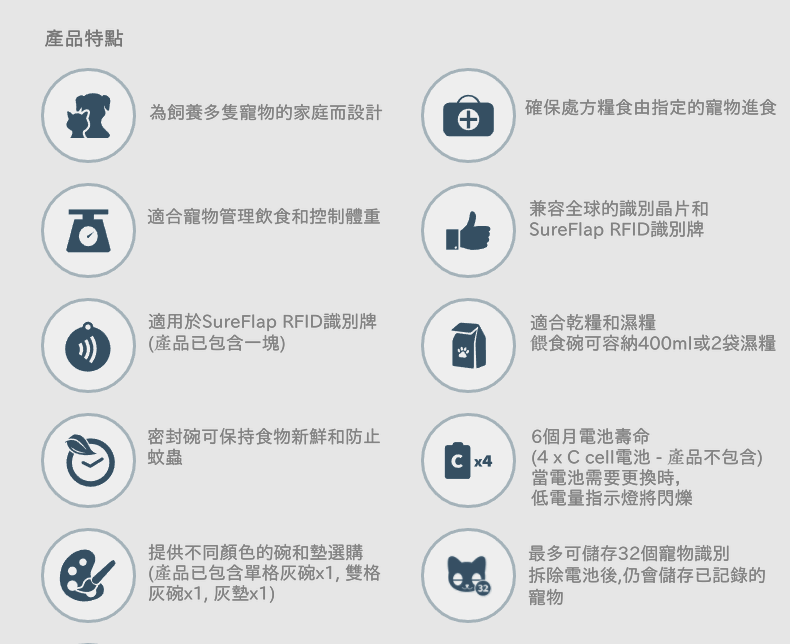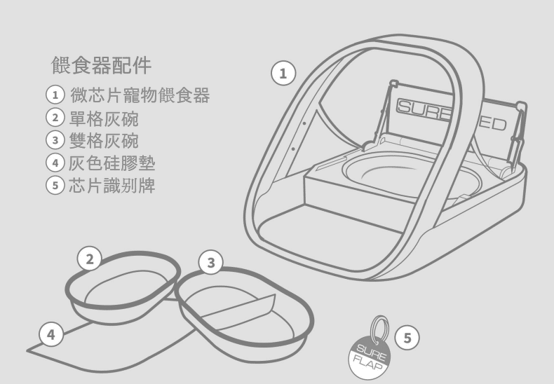 - SUREFEED MICROCHIP 的芯片識別餵食器是一種選擇性的餵食器,透過識別主子的微芯片編號或 RFID 識別牌而打開餵食器的蓋子