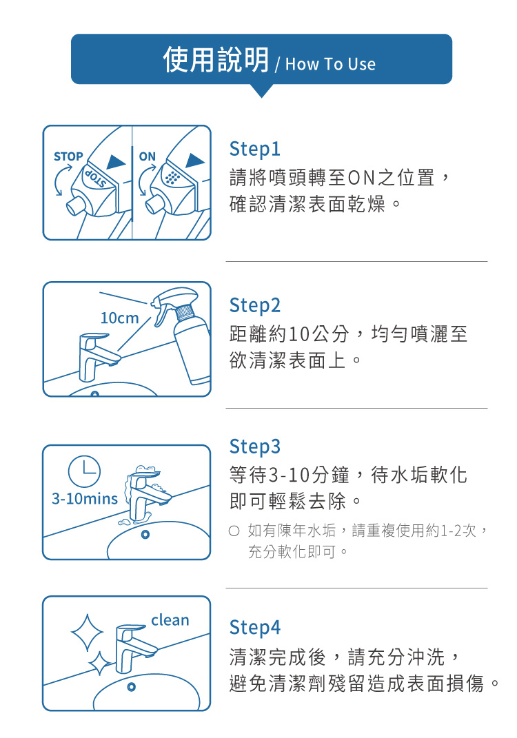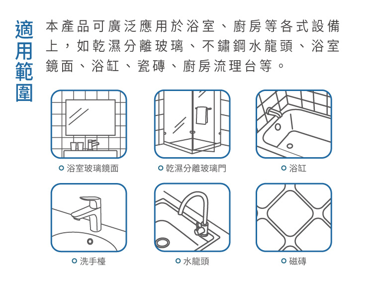 - 請勿使用於大理石、天然石材、石英磚、無釉地磚,避免造成表面損傷