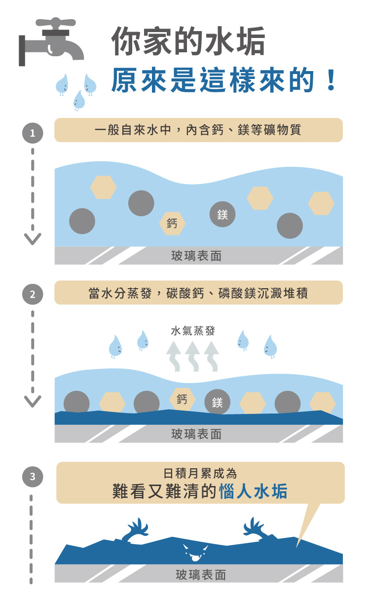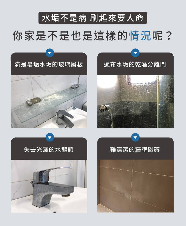 家中的水龍頭、玻璃、鏡子或是蓮蓬頭,都被水垢侵襲無一倖免
