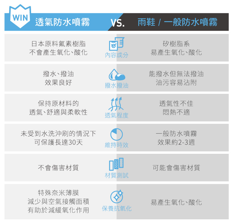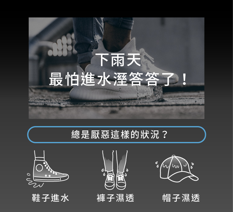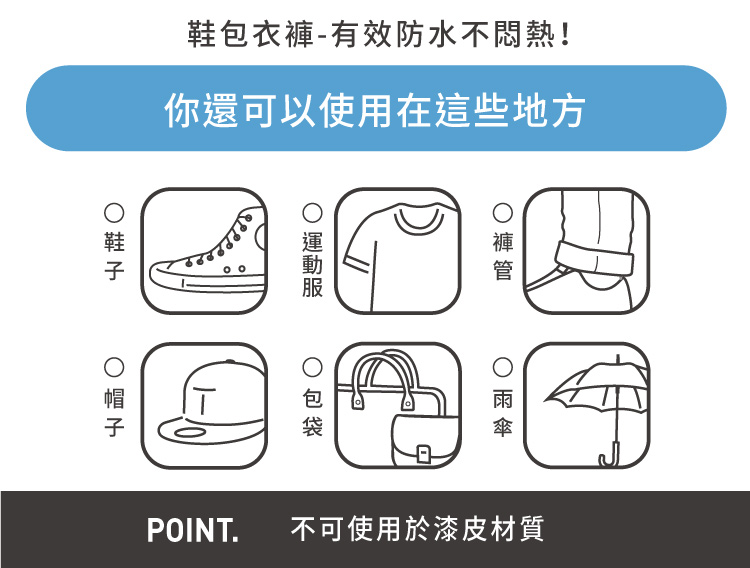 - 有效防水防髒,並保持鞋子的透氣與柔軟性,即使碰上突如其來的傾盆大雨也能自在行走,無論球鞋、皮鞋或帆布鞋,再也不用擔心愛鞋弄濕