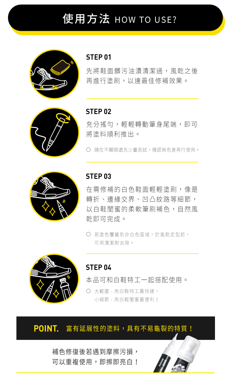 • 可用於白色之合成皮革、天然皮革、帆布、塑膠及橡膠製品